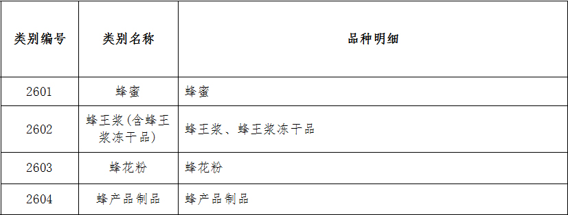 蜂產品類別編號及類別名稱:2601蜂蜜2602蜂王漿(含蜂王漿凍干品)2603蜂花粉2604蜂產品制品