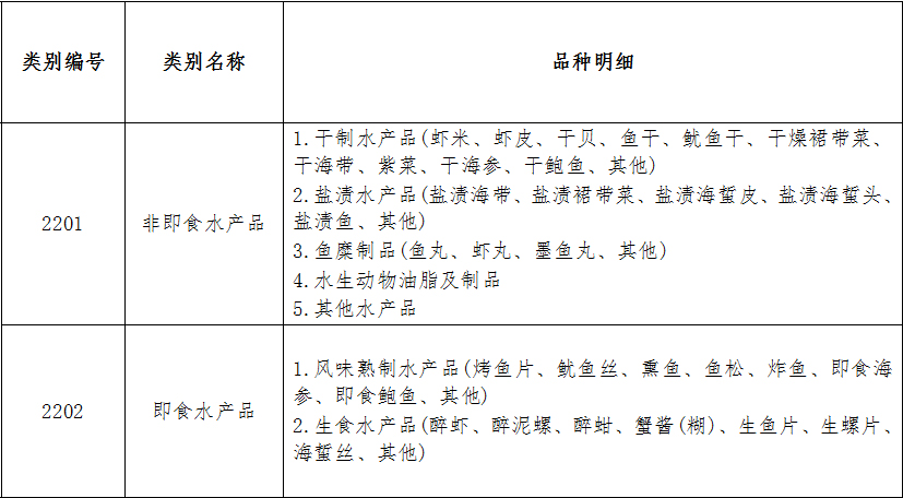 水產(chǎn)制品類別編號及類別名稱:2201非即食水產(chǎn)品;2202即食水產(chǎn)品