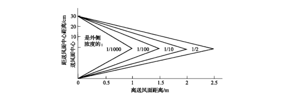 自凈器的作用有兩點:一是設置于亂流潔凈室的四角和其他渦流區,以減少灰塵滯留的機會;二是作為操作點的臨時凈化措施。在面對自凈器潔凈氣流的距離上,可形成一個潔凈空氣籠罩的地段,在直流情況下,這一地段的空氣潔凈度和周圍空氣潔凈程度之比可如圖1所示。