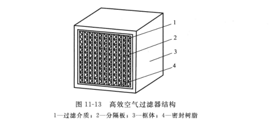 高效過濾器的特點是效率高、壓降大、不能再生,一般2~3年更換一次。高效過濾器對細(xì)菌的濾除效率接近100%,即通過高效空氣過濾器后的空氣可視為無菌空氣。此外,高效過濾器的安裝方向不能裝反。高效空過濾器的結(jié)構(gòu)如圖11-13所示