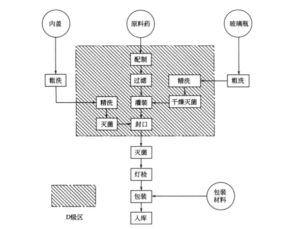 最終滅菌口服液劑的主要生產(chǎn)工序包括稱量、配制、過濾、洗瓶和蓋、灌裝、封口、滅菌、燈檢、包裝和入庫等,其生產(chǎn)工藝流程及對環(huán)境的潔凈等級要求如圖1所示,其中稱量、配制、過濾、精洗瓶和蓋、灌裝封口等工序應(yīng)在不低于D級的潔凈環(huán)境中進(jìn)行。
