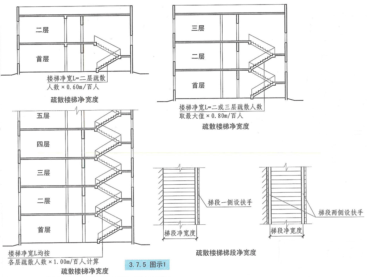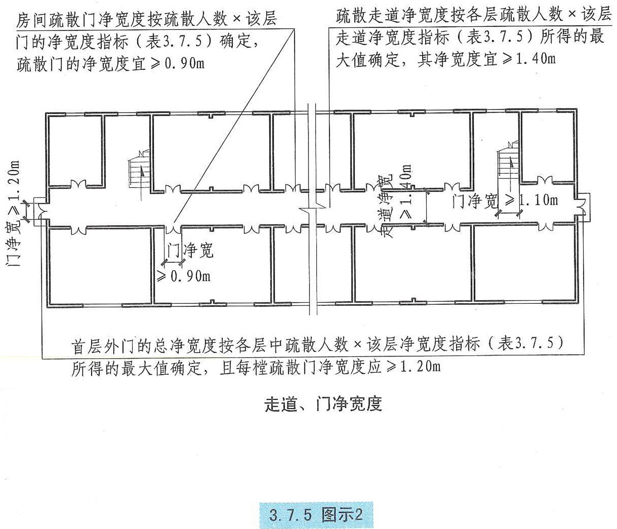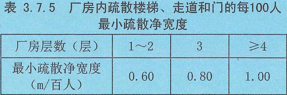 3.7.5 廠房內疏散樓梯、走道、門的各自總凈寬度,應根據疏散人數按每100人的最小疏散凈寬度不小于表3.7.5的規定計算確定【圖示1】。