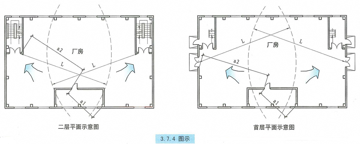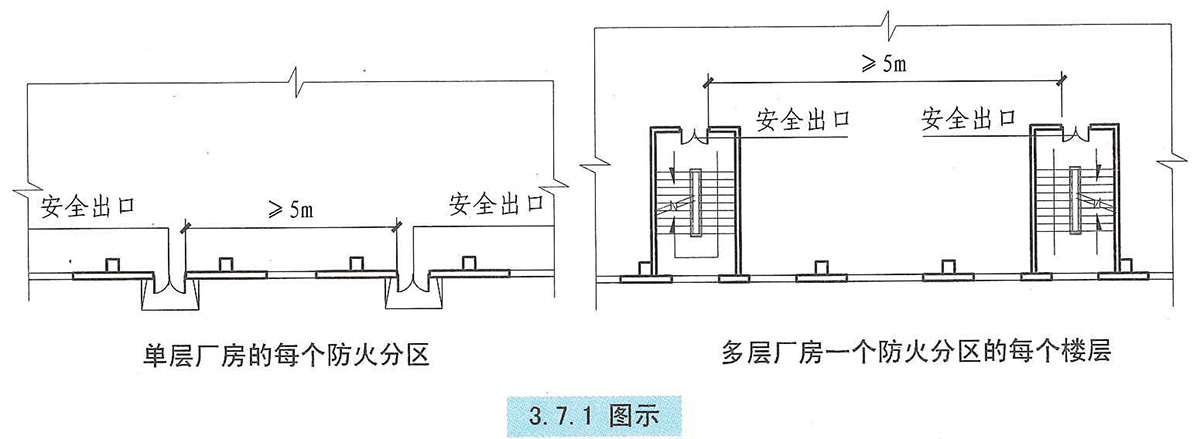 3.7.1 廠房的安全出口應分散布置。每個防火分區或一個防火分區的每個樓層,其相鄰2個安全出口最近邊緣之間的水平距離不應小于5m。【圖示】