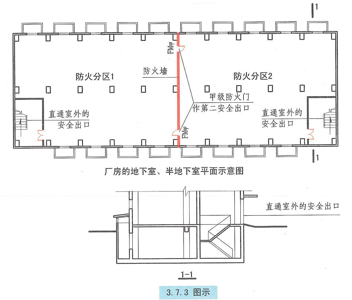 3.7.3 地下或半地下廠房(包括地下或半地下室),當有多個防火分區相鄰布置,并采用防火墻分隔時,每個防火分區可利用防火墻上通向相鄰防火分區的甲級防火門作為第二安全出口,但每個防火分區必須至少有1個直通室外的獨立安全出口。【圖示】