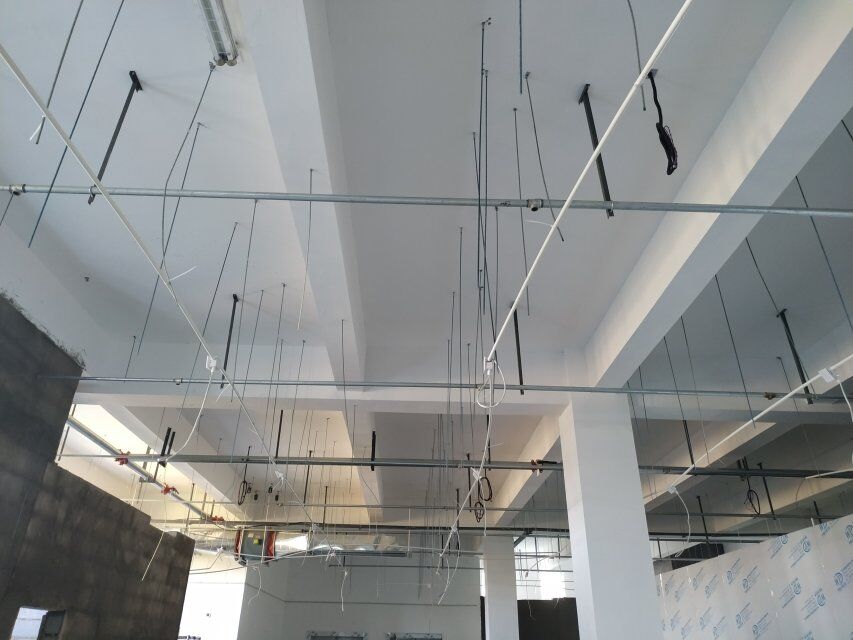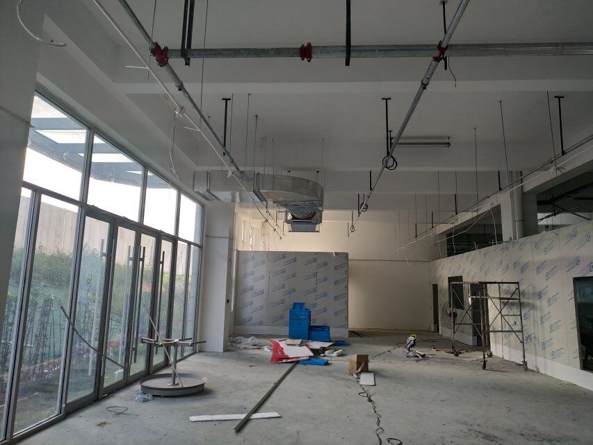 青島盛客隆食品有限公司廠裝修,吊筋安裝完成,墻板開孔