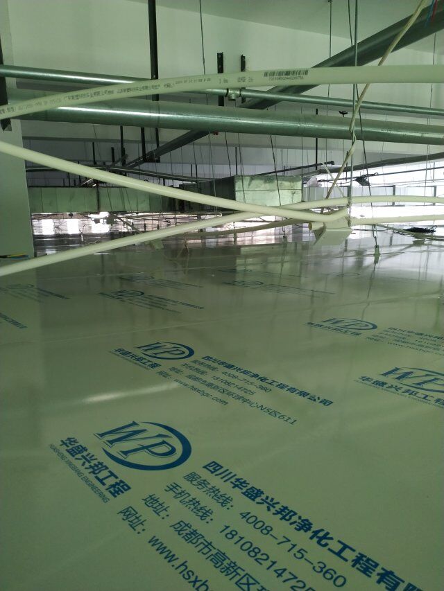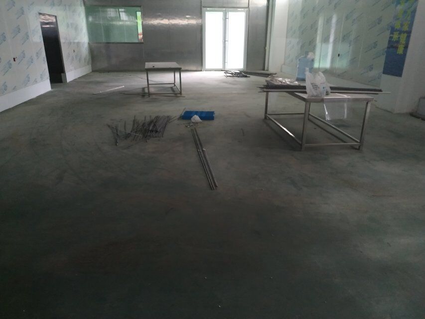 青島盛客隆食品有限公司廠房裝修現場,洗消池安裝,撕膜完成