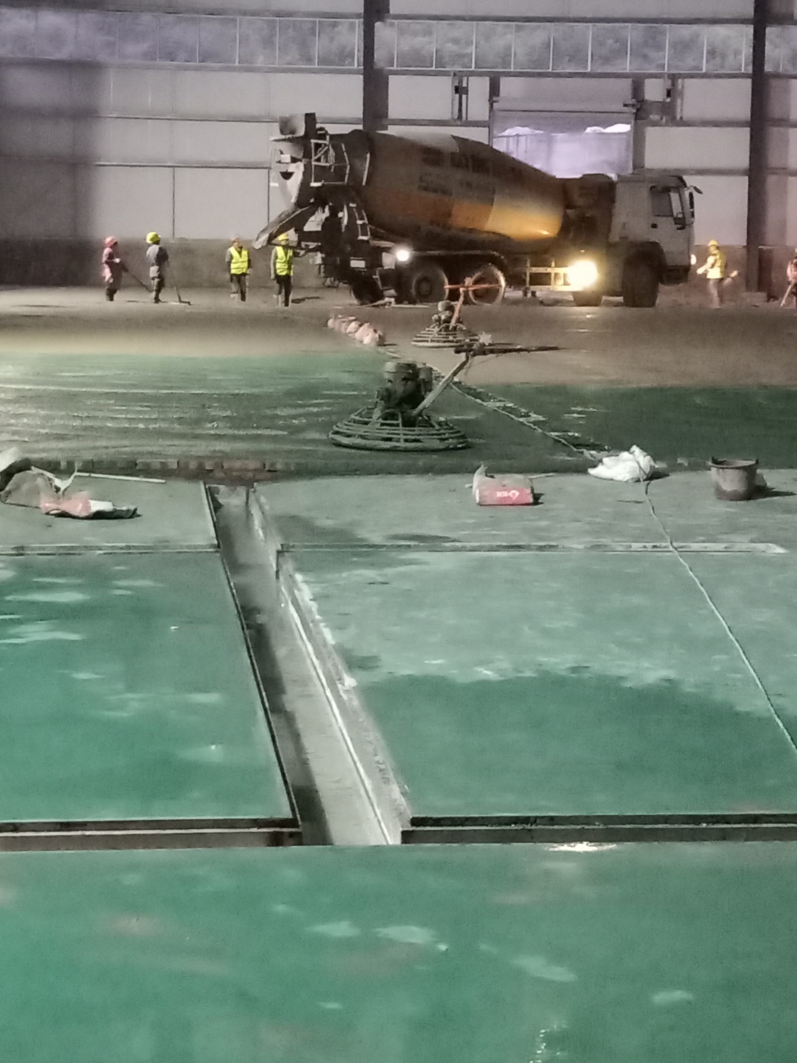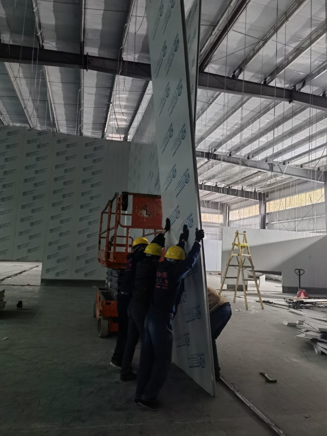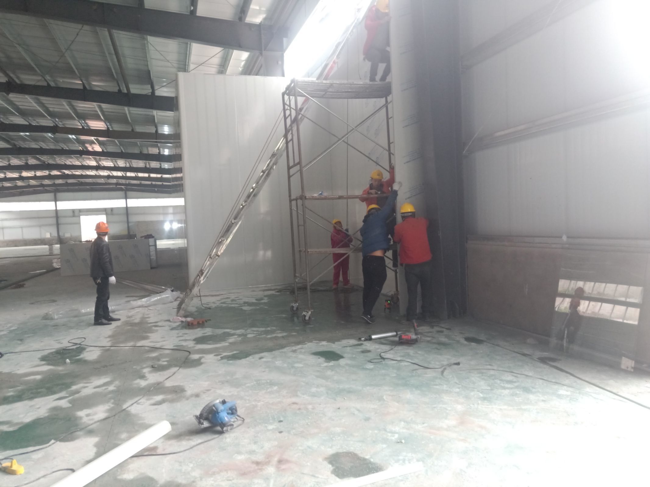 1.4號(hào)廠房地面固化完成百分之九十九。 2.4號(hào)廠房彩鋼隔墻板完成百分之八十。 3.4號(hào)廠房吊頂鋼繩完成百分之九十。 4.3號(hào)廠房擋水墻完成,地面固化開(kāi)始。 5.實(shí)驗(yàn)室pvc地板到場(chǎng)。