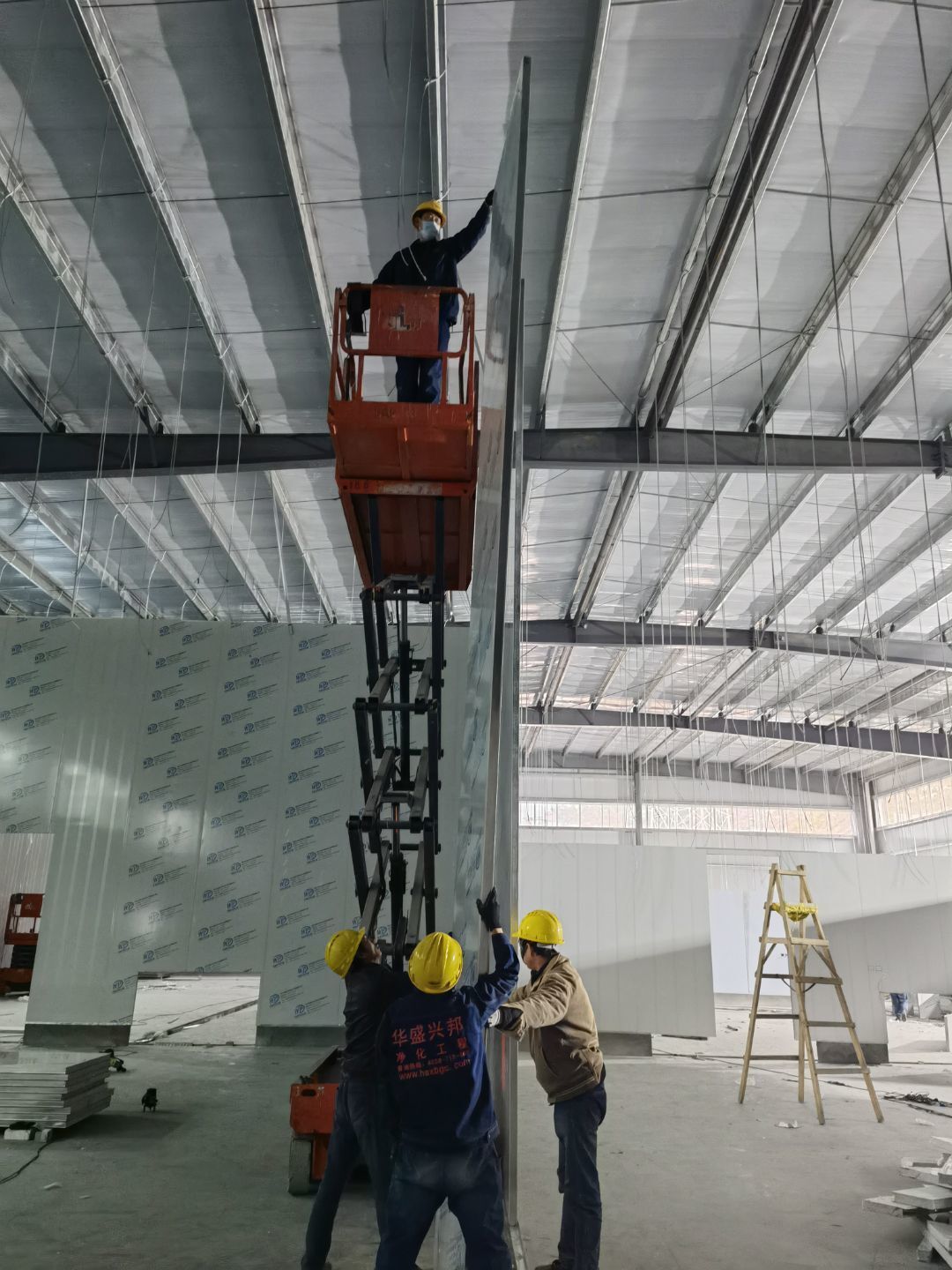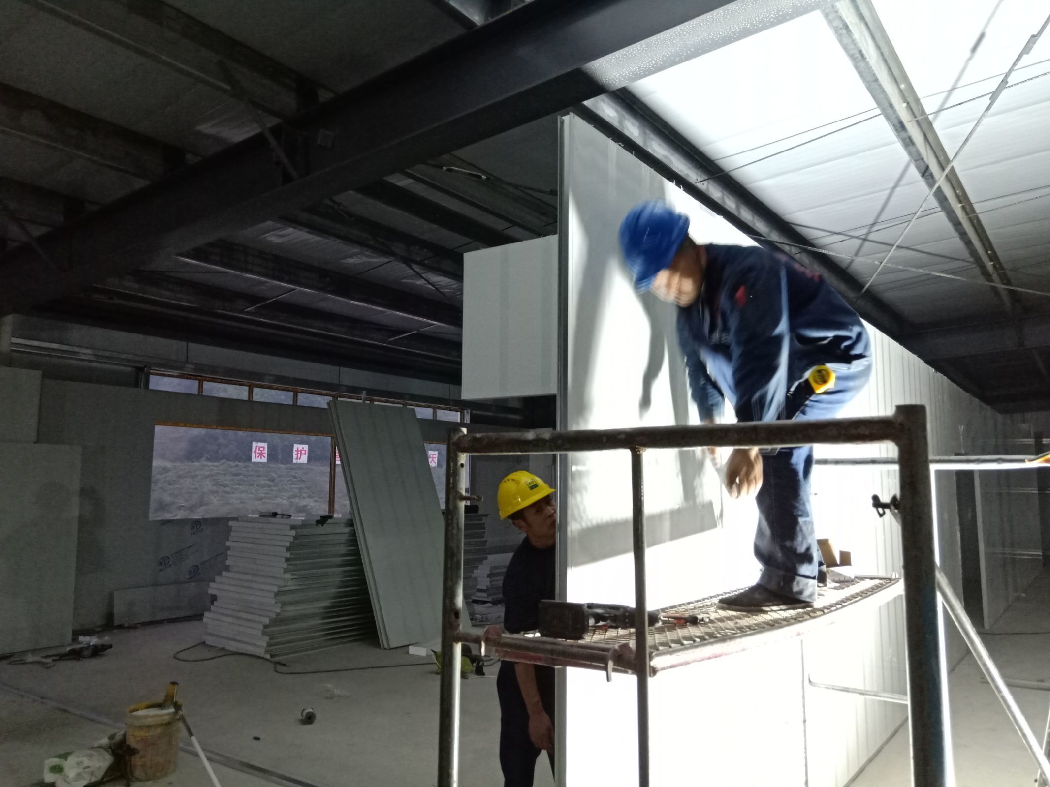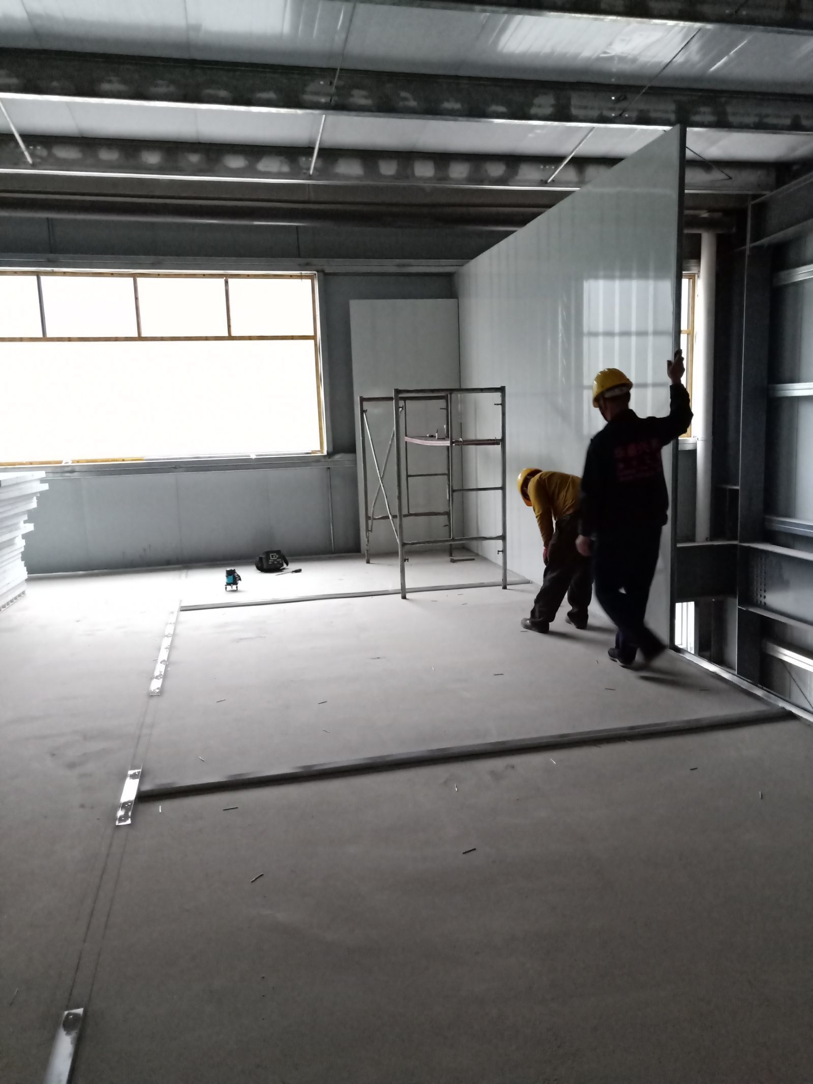 3號(hào)車間2樓平臺(tái)實(shí)驗(yàn)室辦公室區(qū)域墻板安裝完成;3號(hào)車間水溝焊接完成。