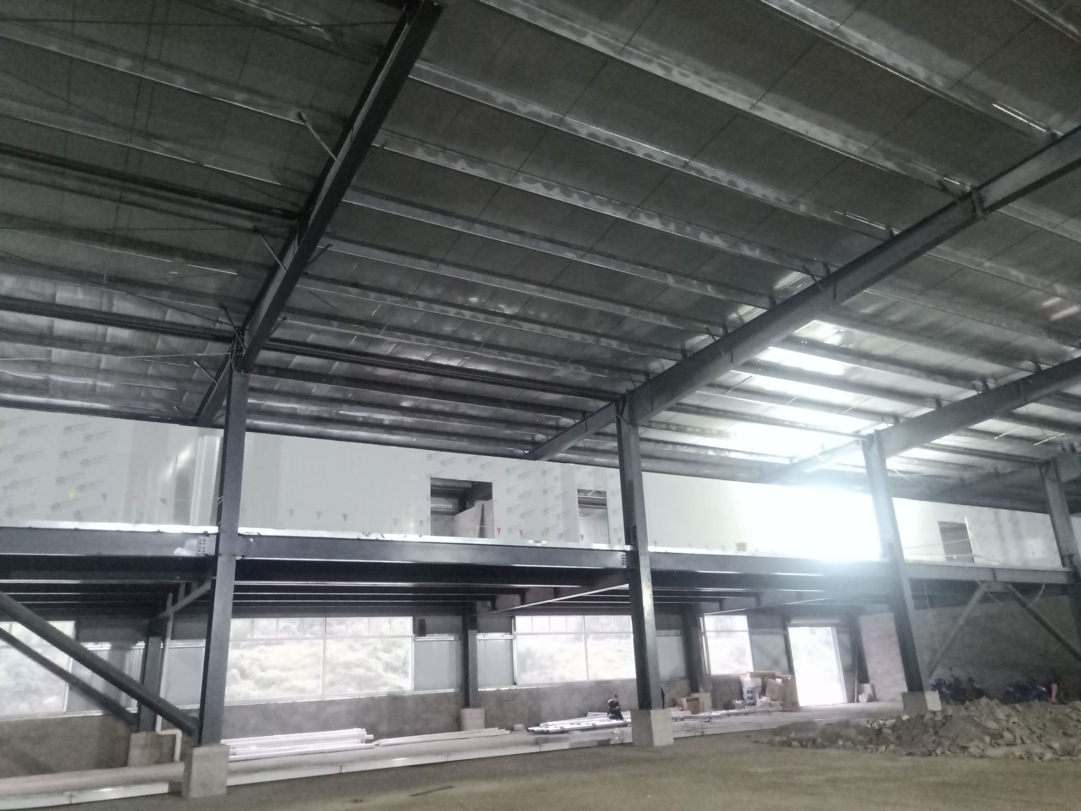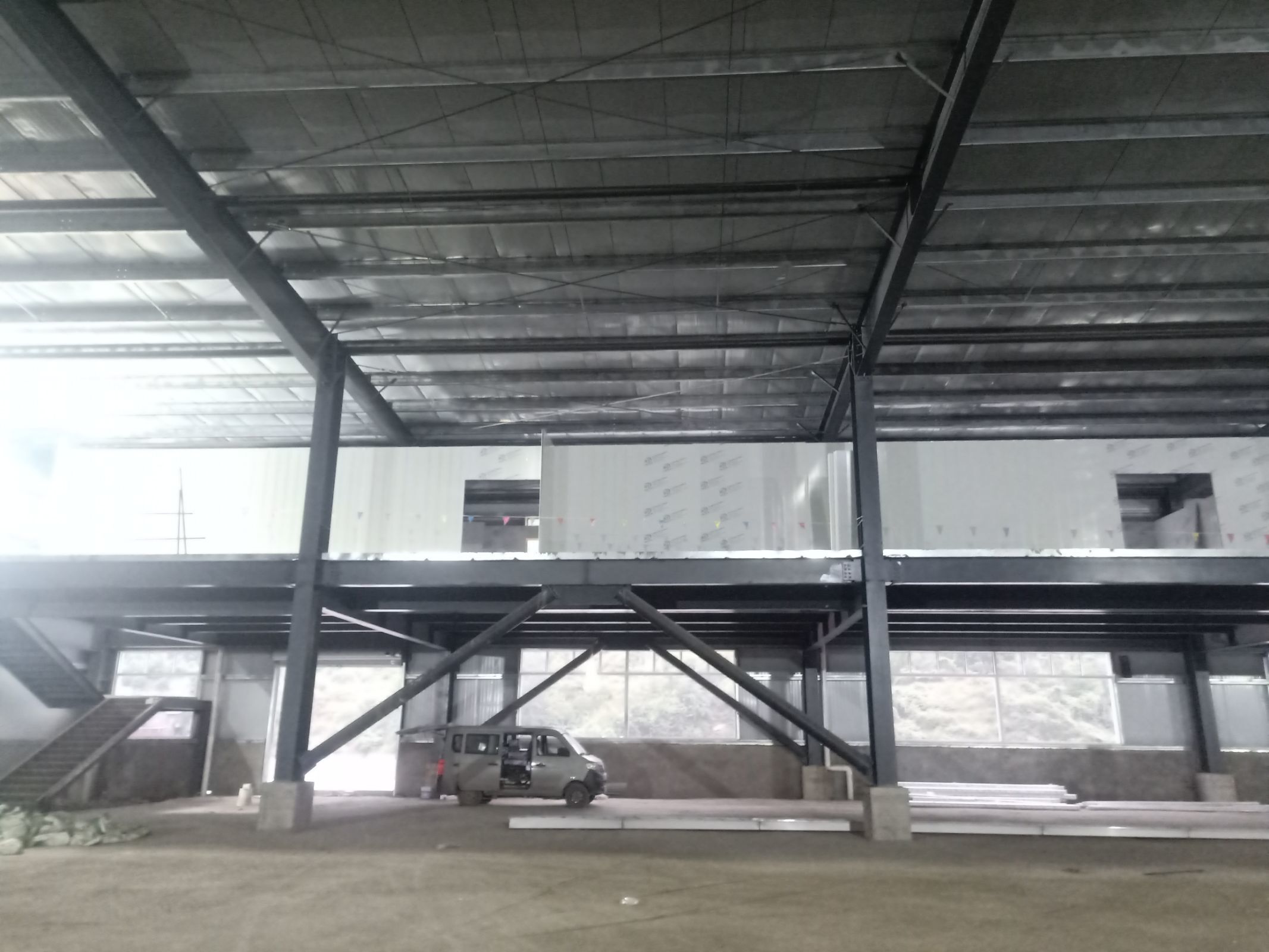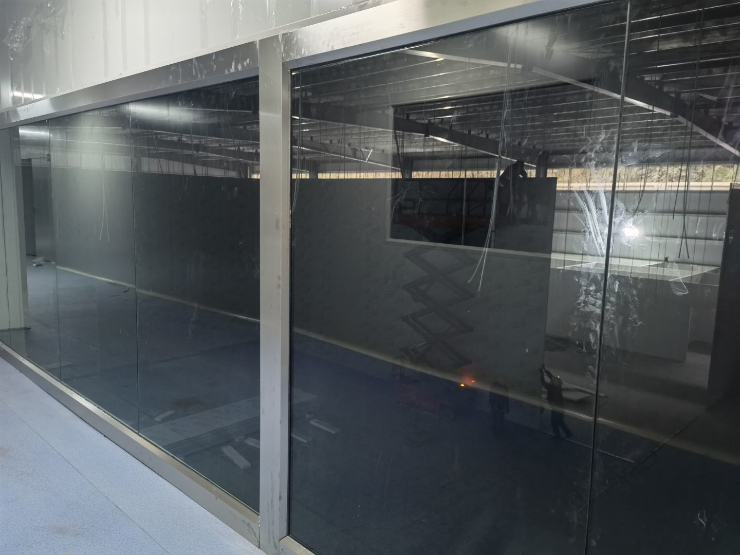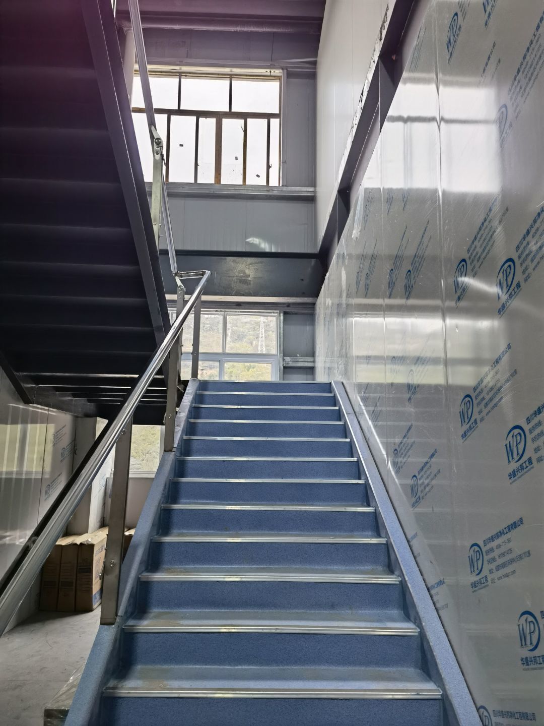 4號(hào)廠房打膠完成百分之80,參觀通道撕膜,樓梯施工