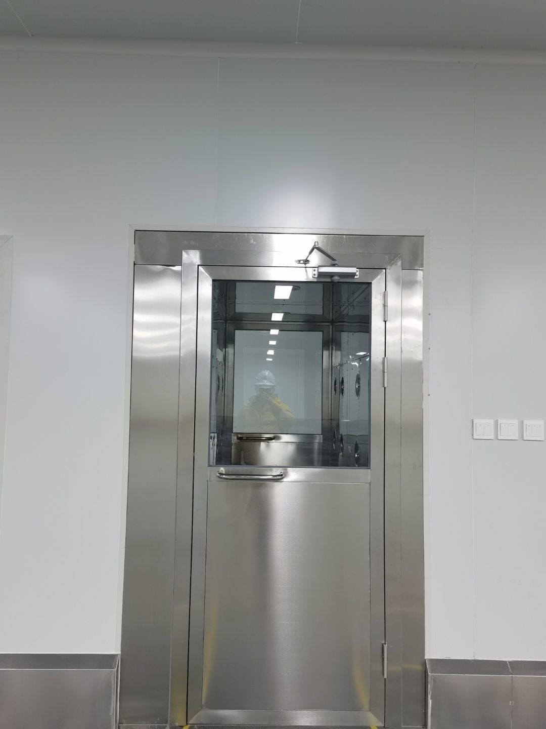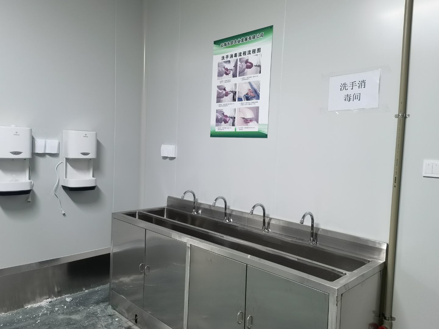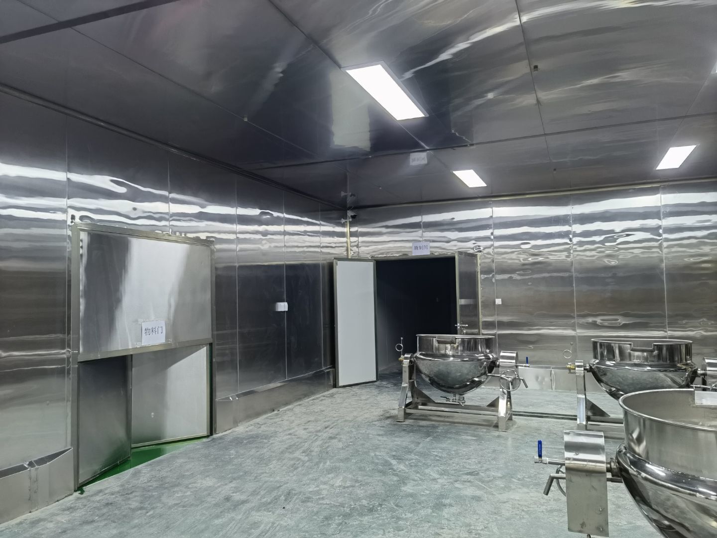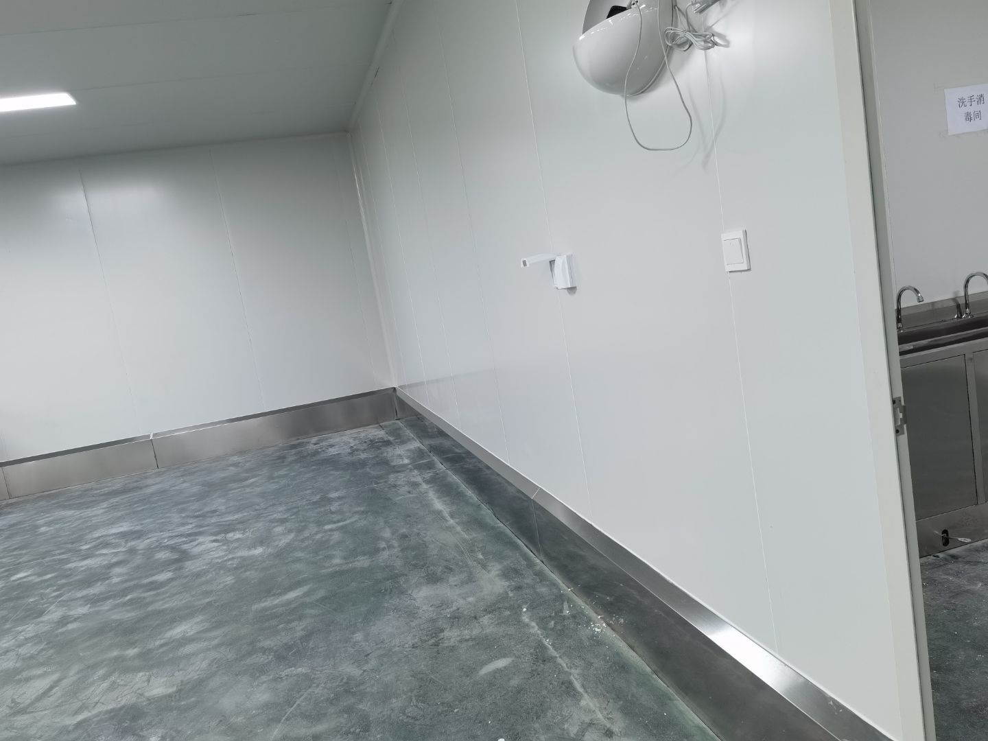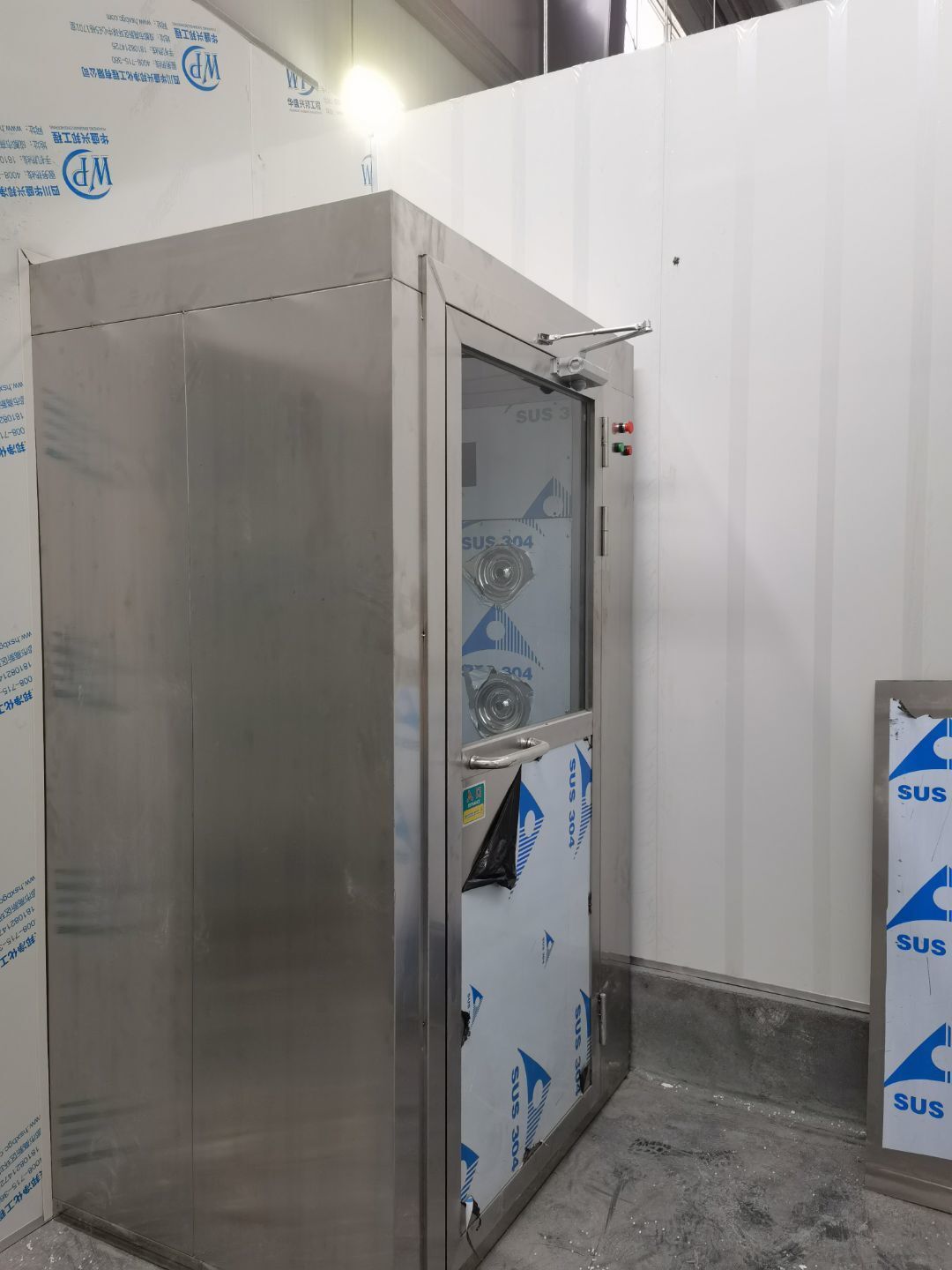 4號(hào)廠房不銹鋼制品風(fēng)淋室消毒洗手池等安裝完成,風(fēng)淋室擺放完成