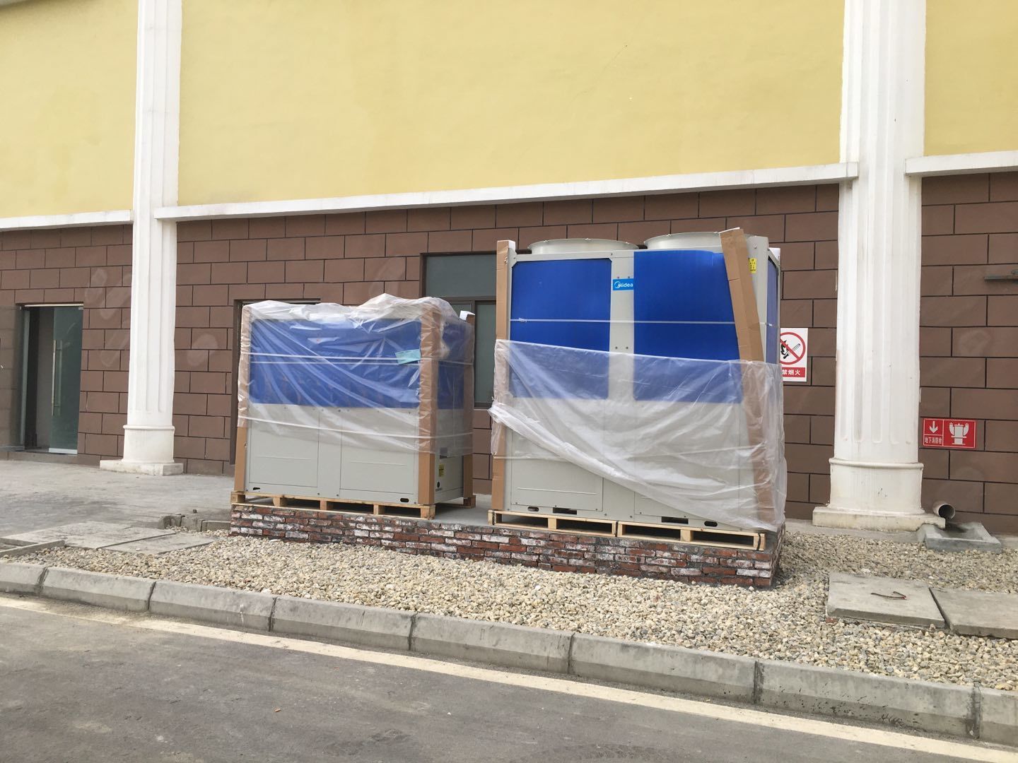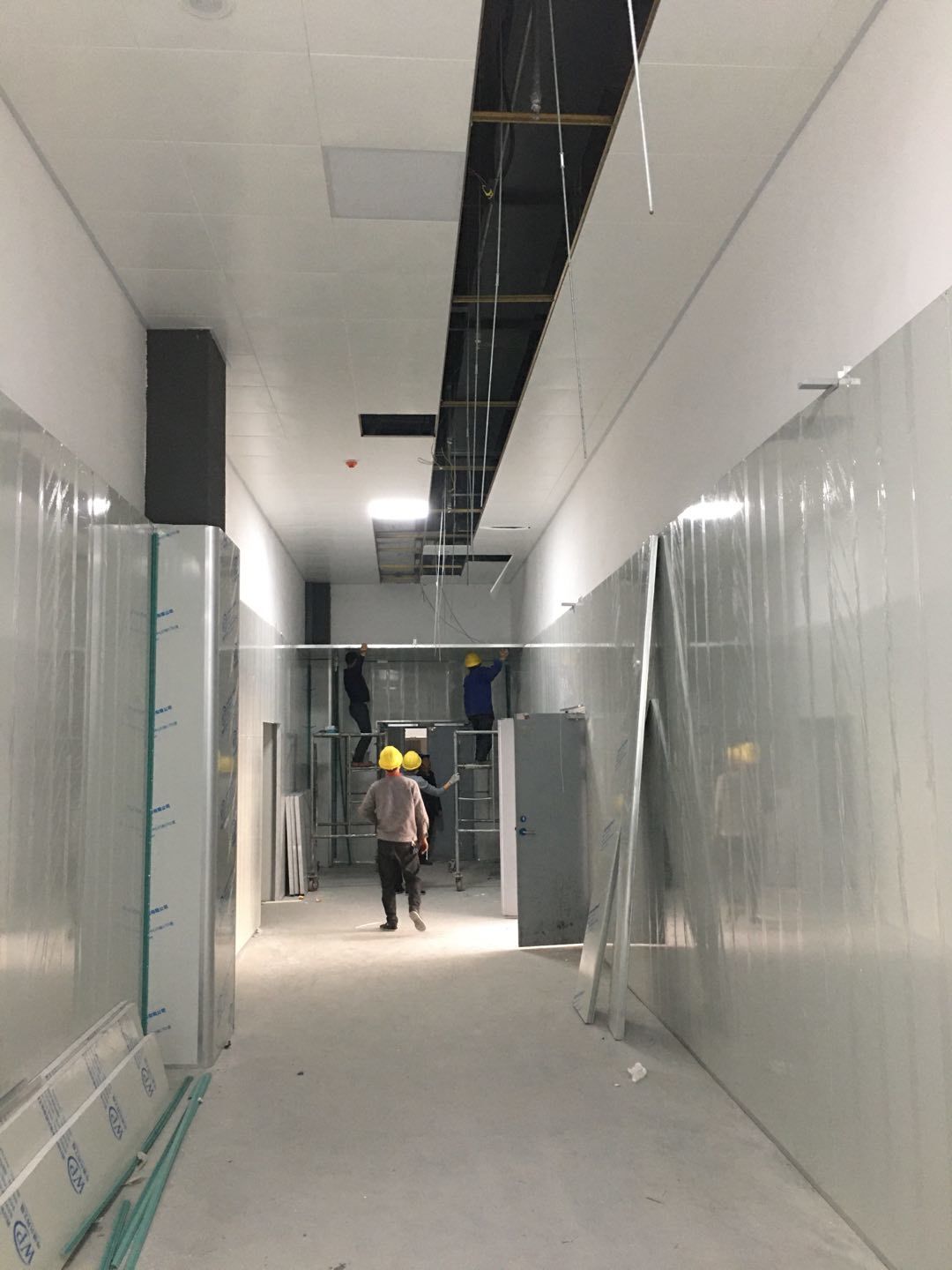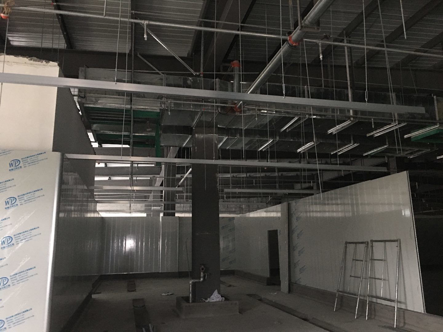 1:彩板班組~收尾工作進度50%左右。2:空調班組~主要設備及風道均已吊裝完成。剩余工作:主機配管,配線調試,安裝風口。3:水電班組-空調電源配線完成約35%,剩余工作:動力電施工,吊頂到給水點位的不銹鋼管施工,配電箱安裝調試。
