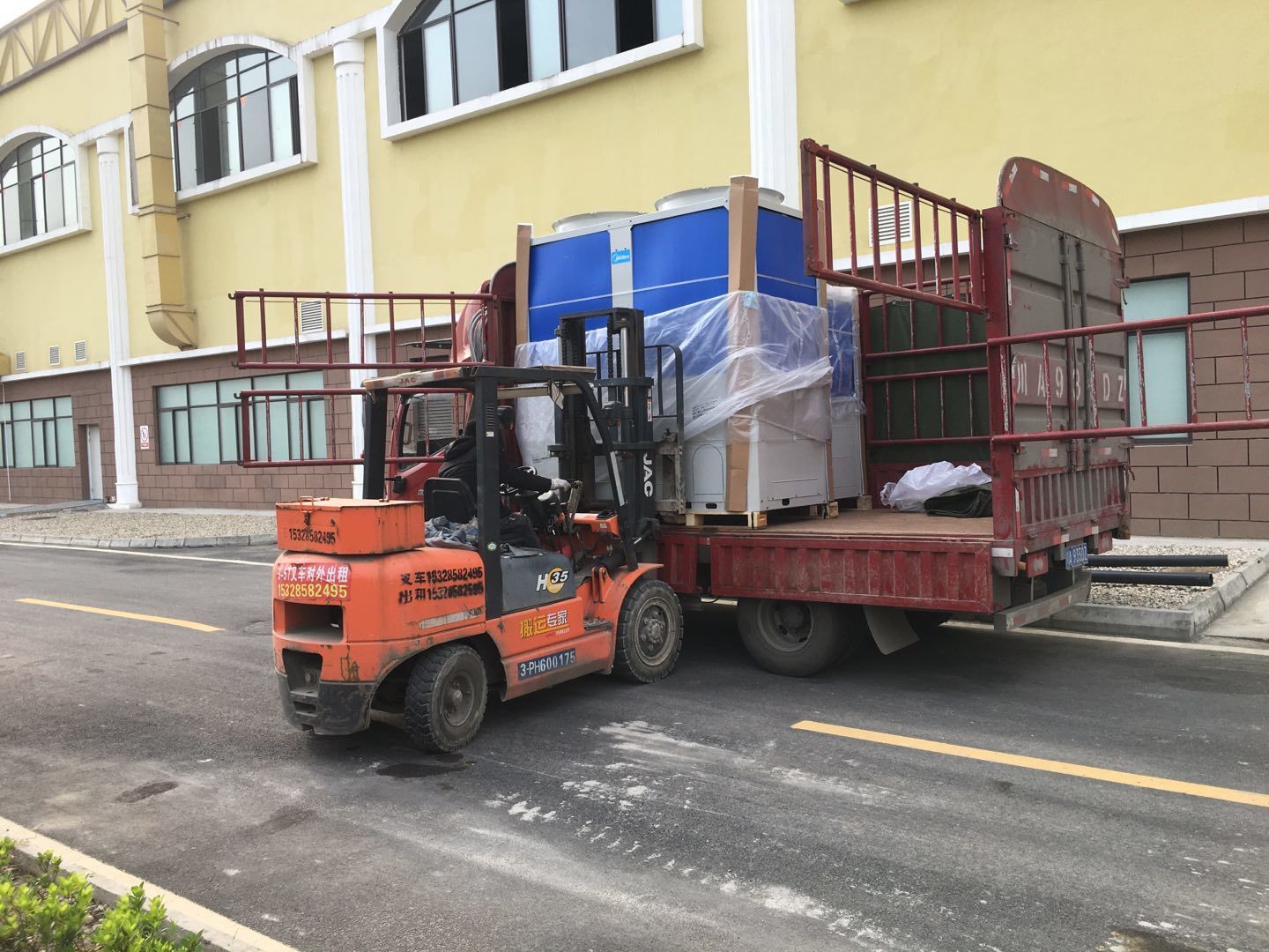 1:彩板班組~收尾工作進度30%。2:空調班組~管道安裝完成,風機已吊裝2臺,主機配管。3:水電班組-布線配管。整體進度約80%。