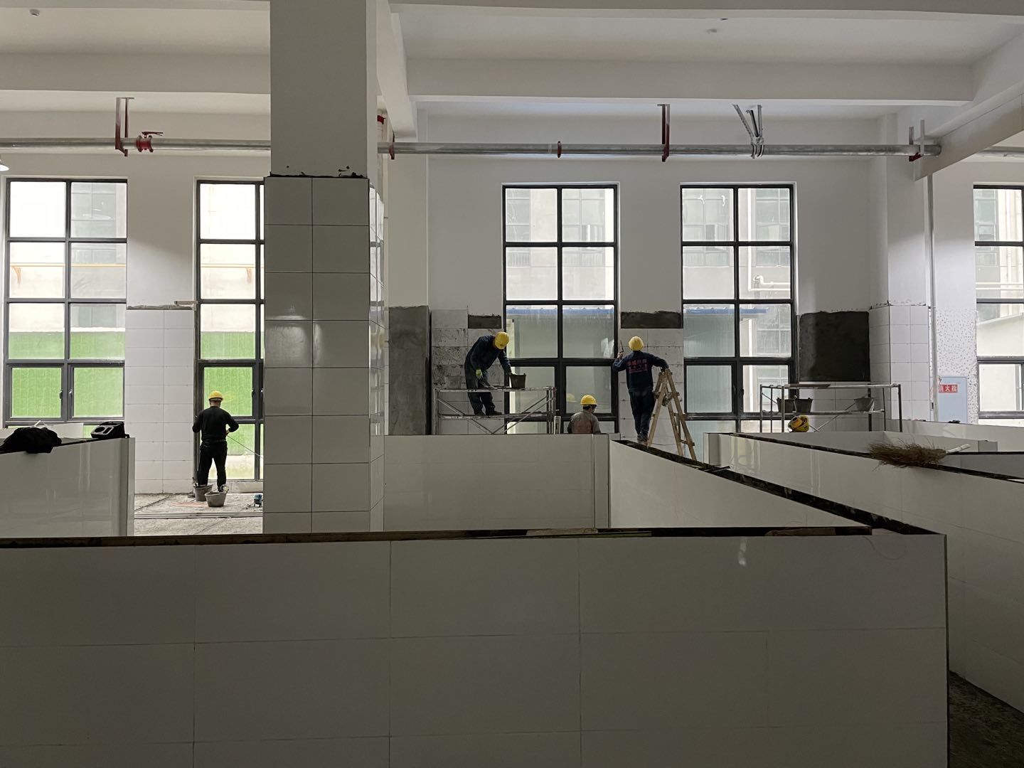 四川鮮美滋食品有限公司廠房裝修現場:1、擋水墻抹灰完成百分之30。 2、水磨石地面抓毛完成百分之35。