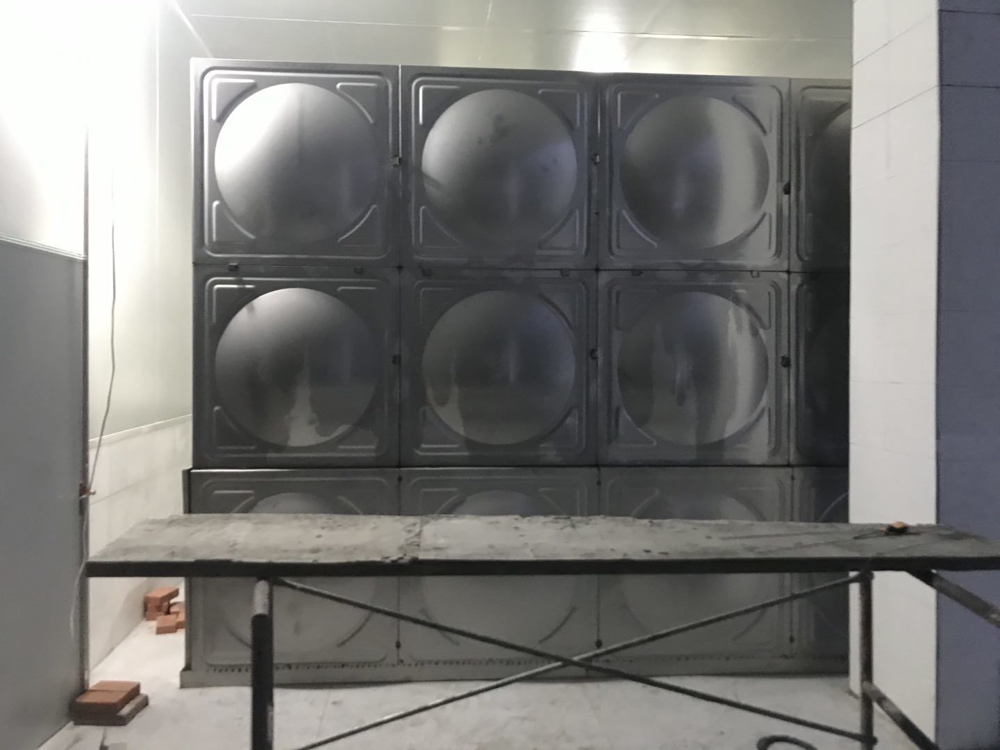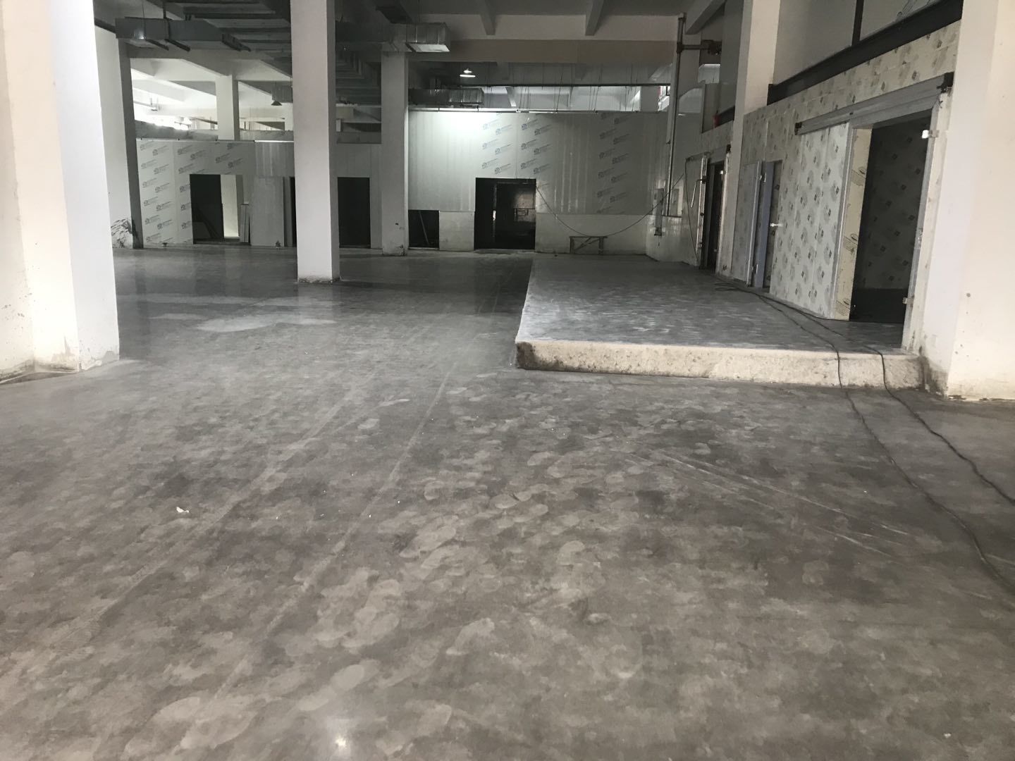 1. 擋水墻防水涂抹。2.水磨石墊層完成。3.凍庫金剛砂地坪完成
