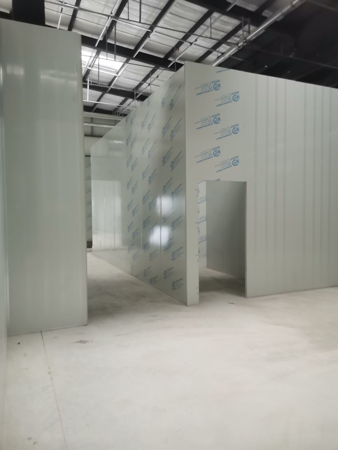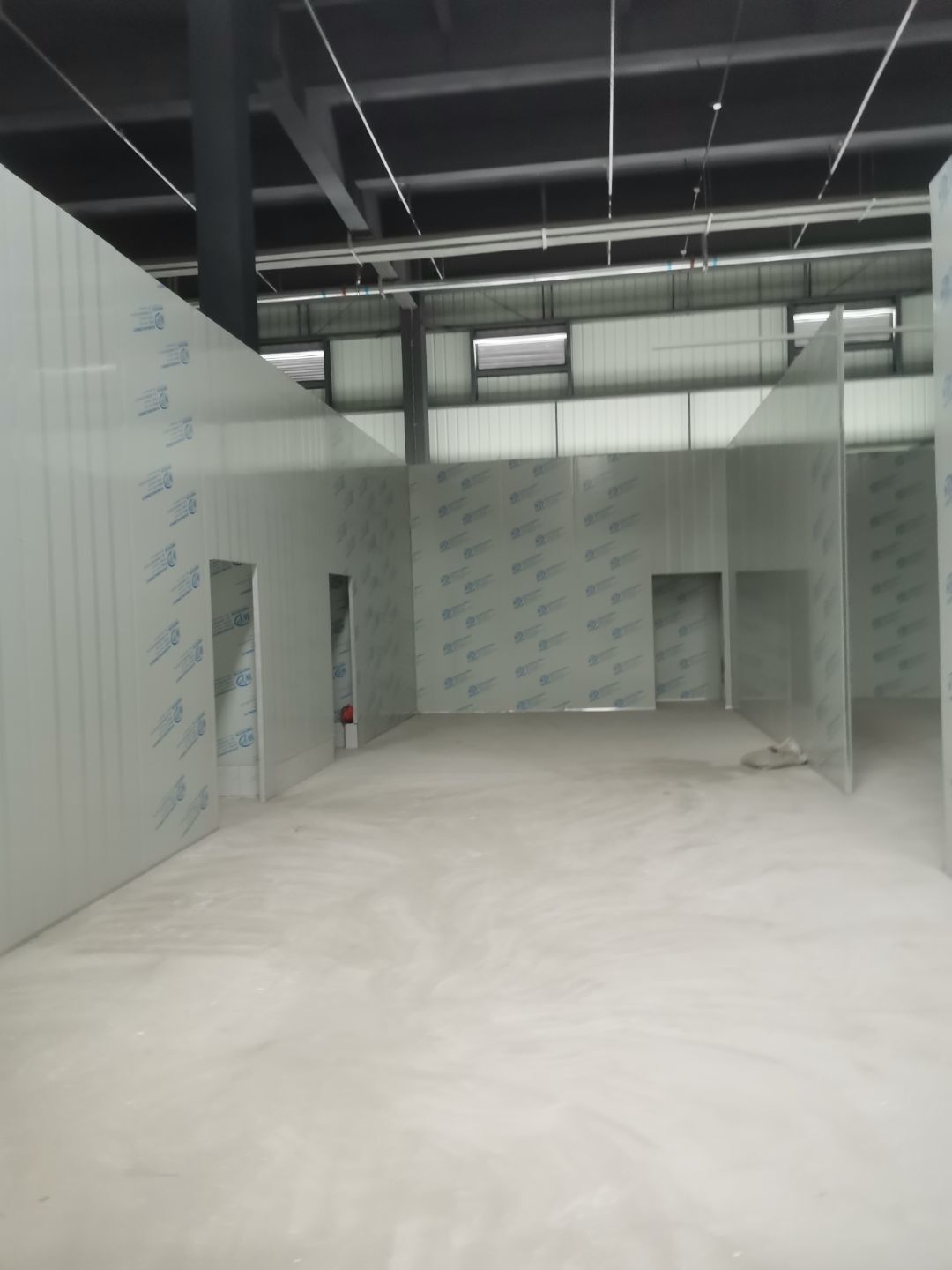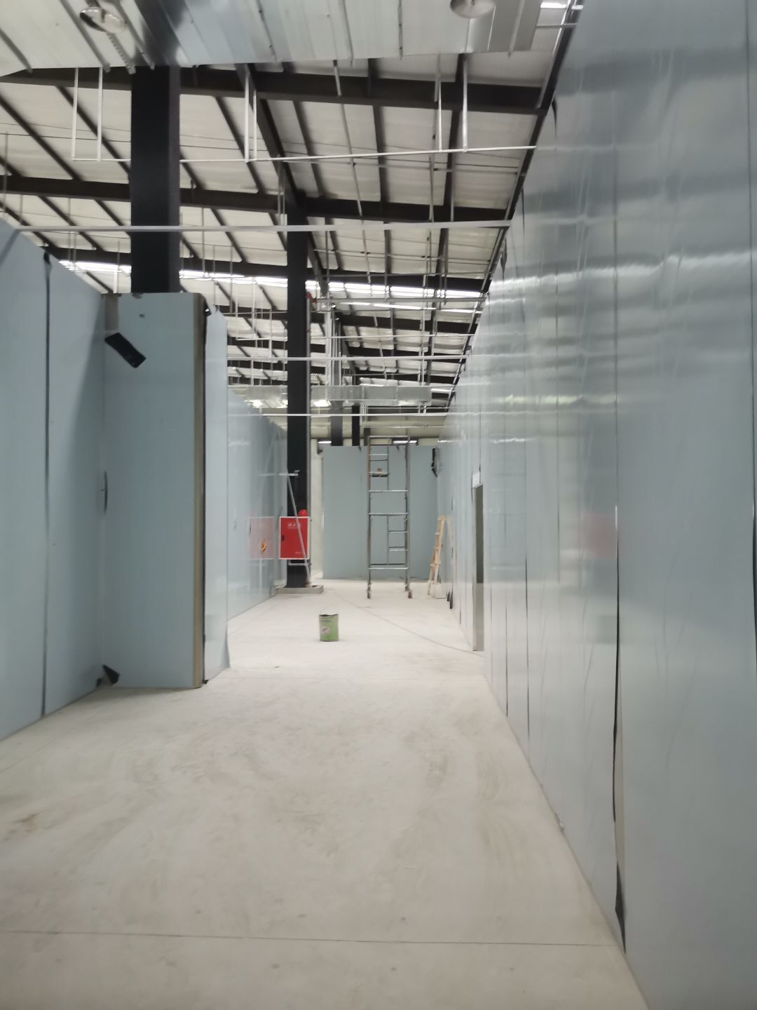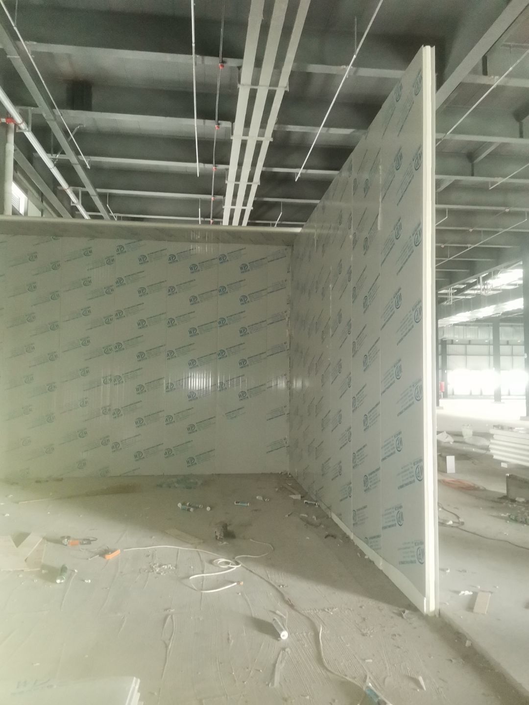 1、擋水墻貼磚完成95%(剩余吊裝口完成后實(shí)施); 2、凍庫庫板安裝完成100%,頂板完成100%; 3、低溫庫加熱絲安裝完成100%,保護(hù)層完成100%,擠塑板完成100%,凍庫地面混凝土澆筑完成100%,切縫完成,養(yǎng)護(hù); 3、彩鋼板安裝完成85%; 4、頂板安裝完成85%; 5、實(shí)驗(yàn)室墻板頂板完成100%; 6、化驗(yàn)室墻板頂板完成100%; 7、工具間墻板完成100%。