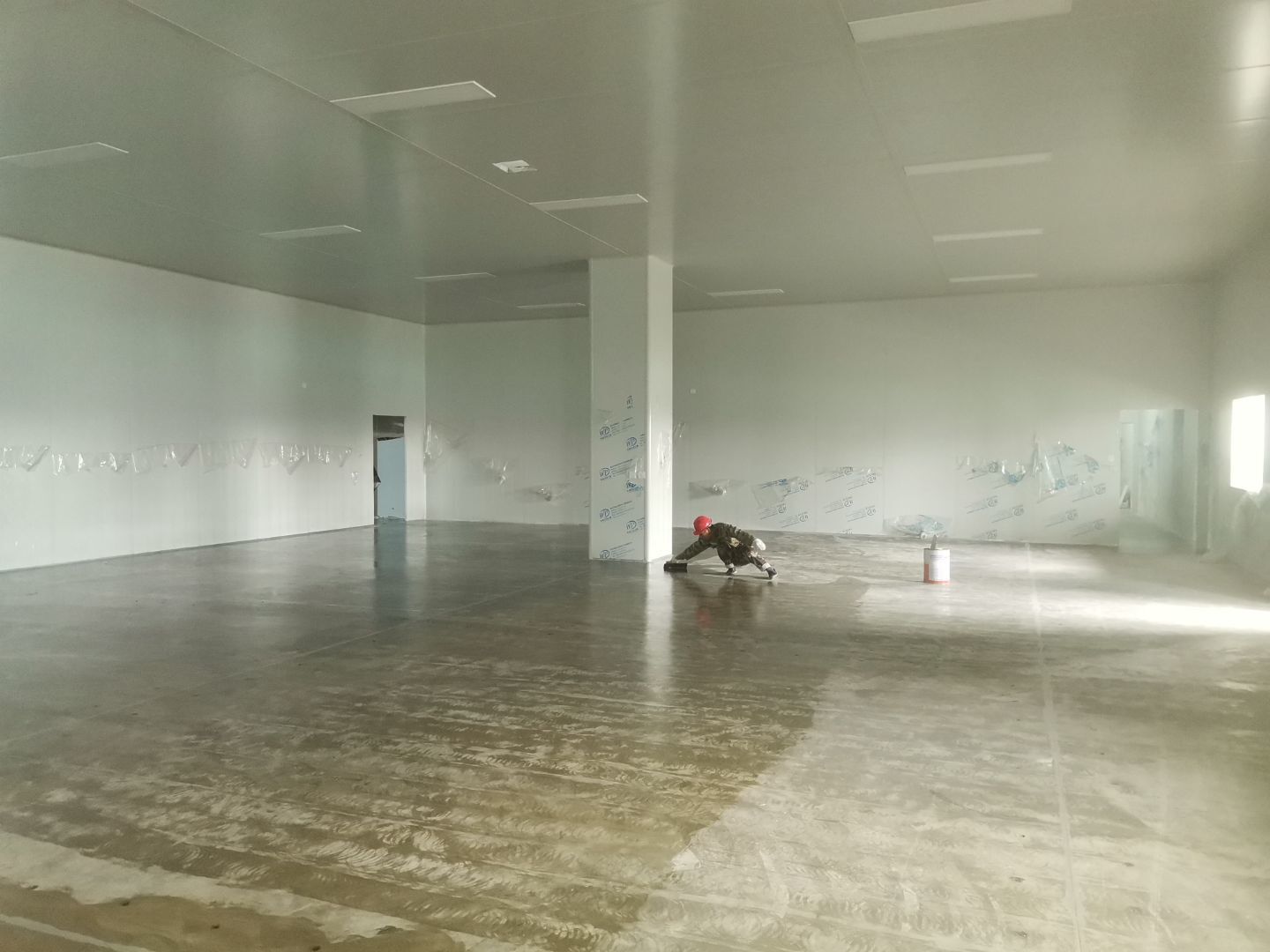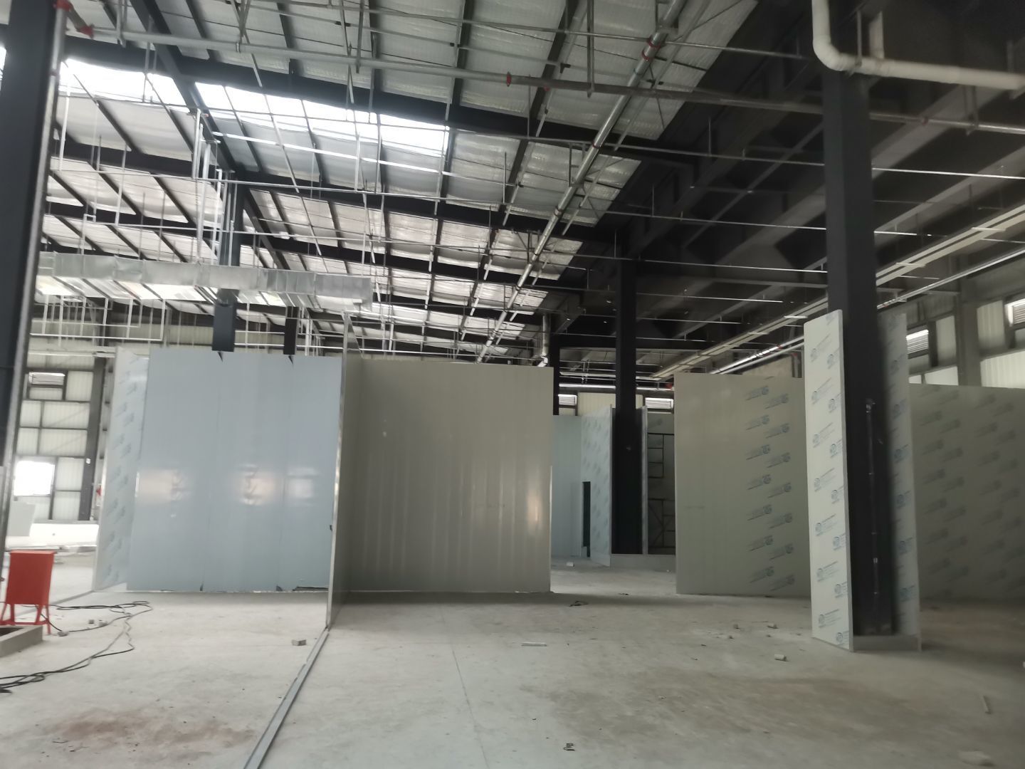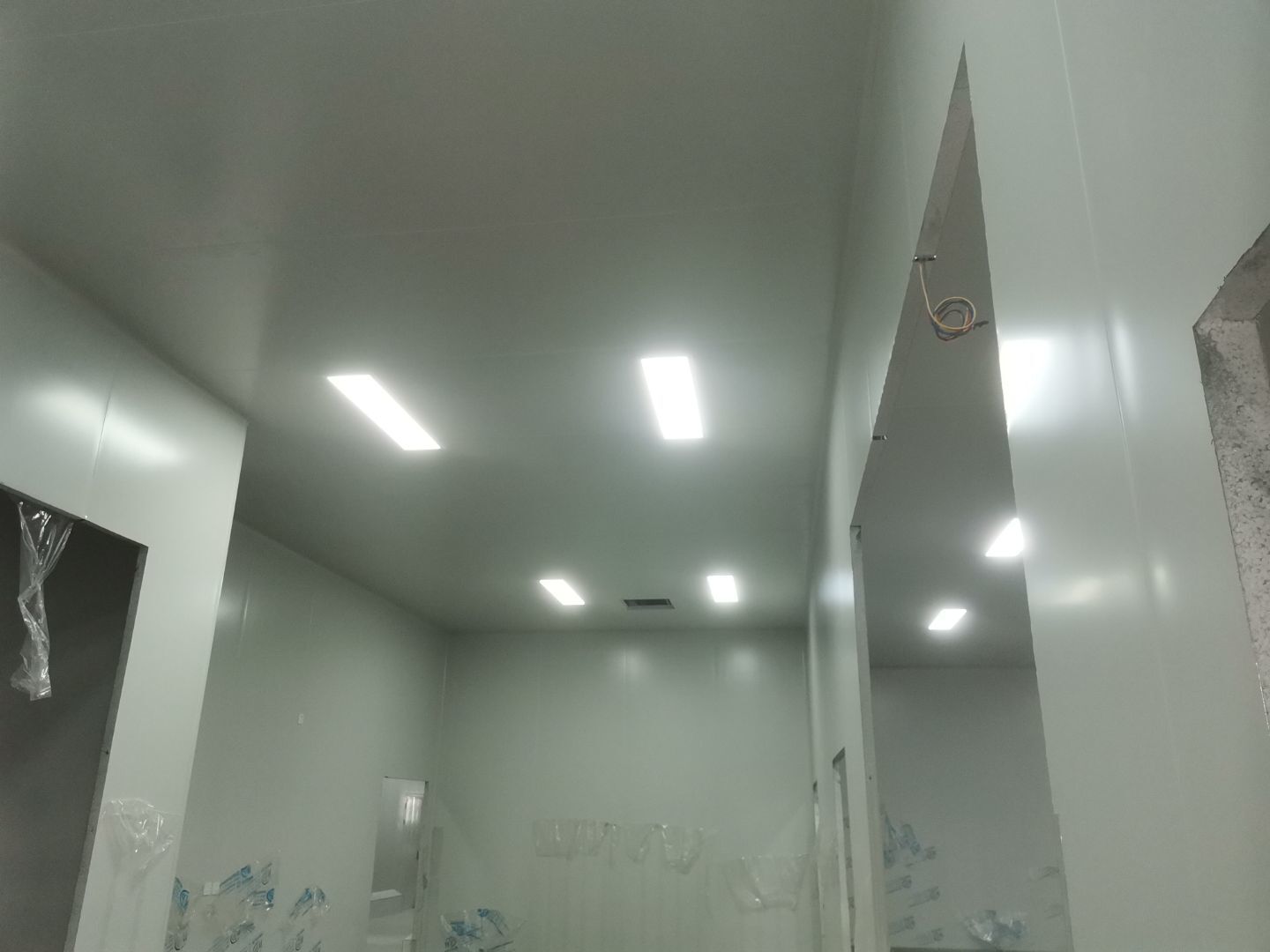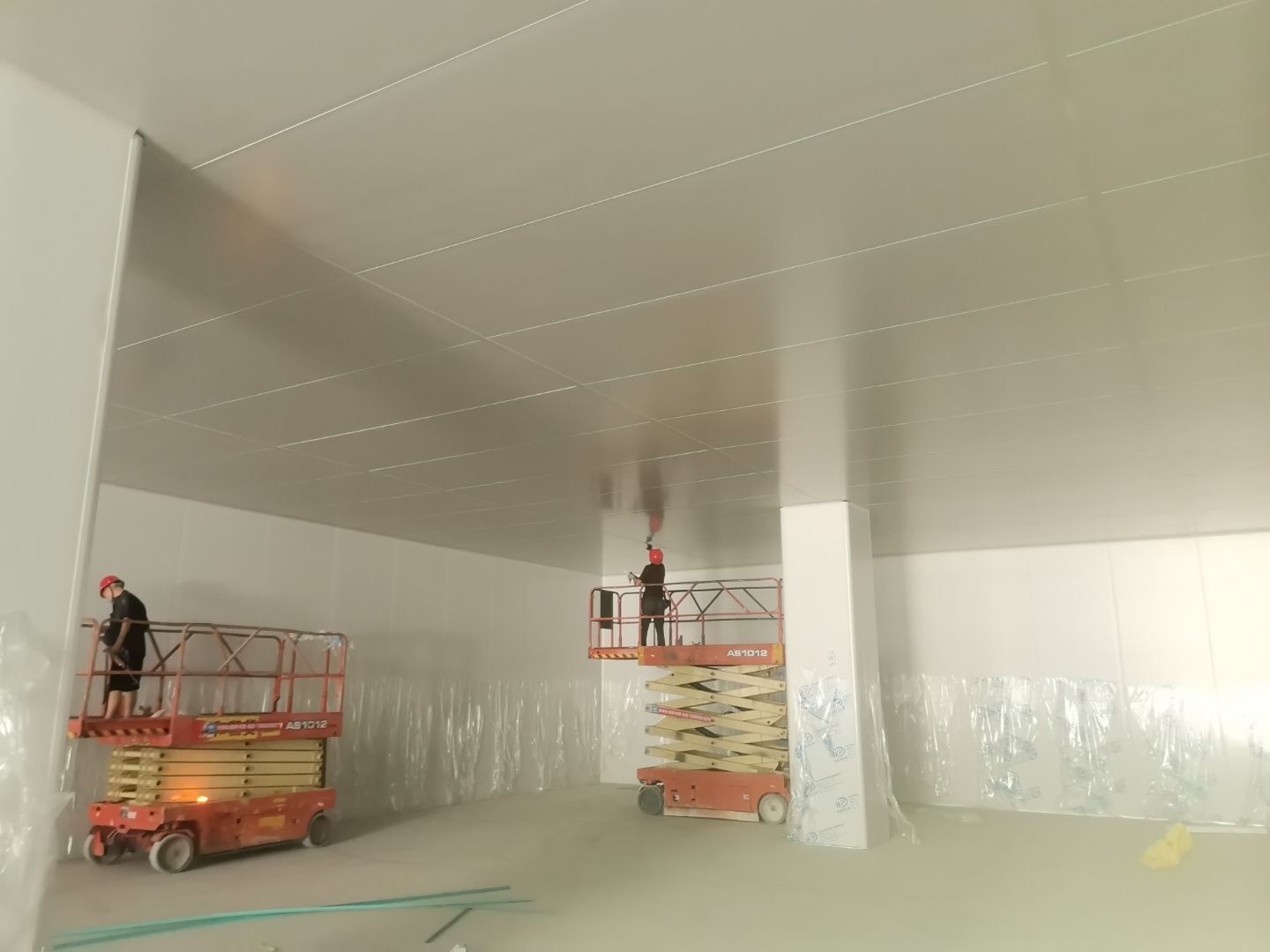 1、擋水墻貼磚完成95%(剩余吊裝口完成后實(shí)施); 2、凍庫庫板安裝完成100%,頂板完成100%; 3、低溫庫加熱絲安裝完成100%,保護(hù)層完成100%,擠塑板完成100%,凍庫地面混凝土澆筑完成100%,切縫完成,養(yǎng)護(hù); 3、彩鋼板安裝完成85%; 4、頂板安裝完成85%; 5、實(shí)驗(yàn)室墻板頂板完成100%; 6、化驗(yàn)室墻板頂板完成100%; 7、工具間墻板完成100%。