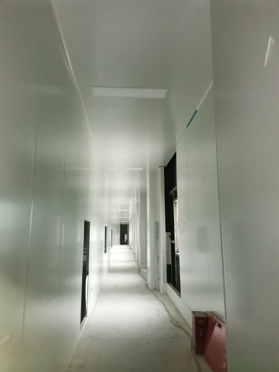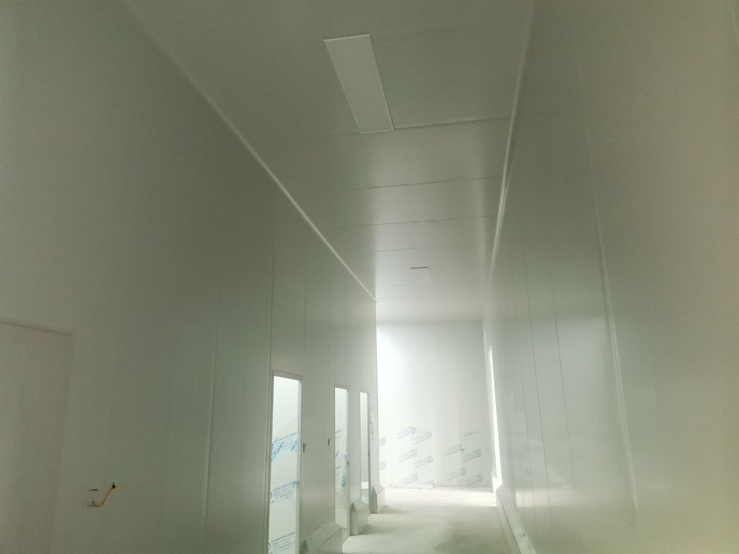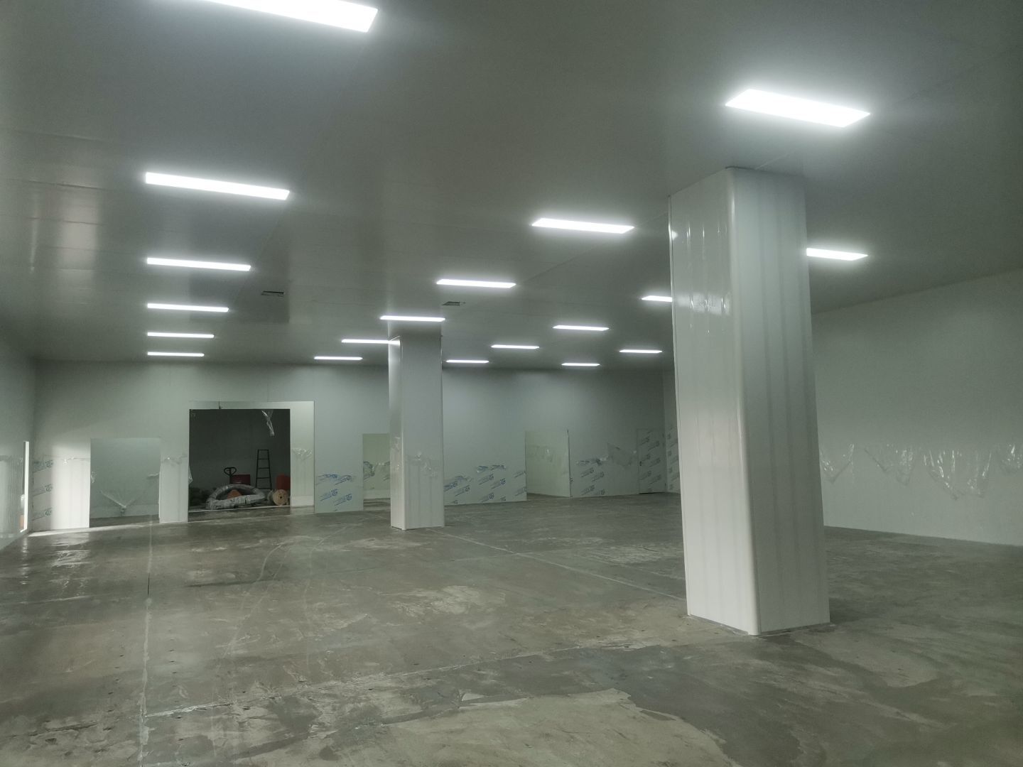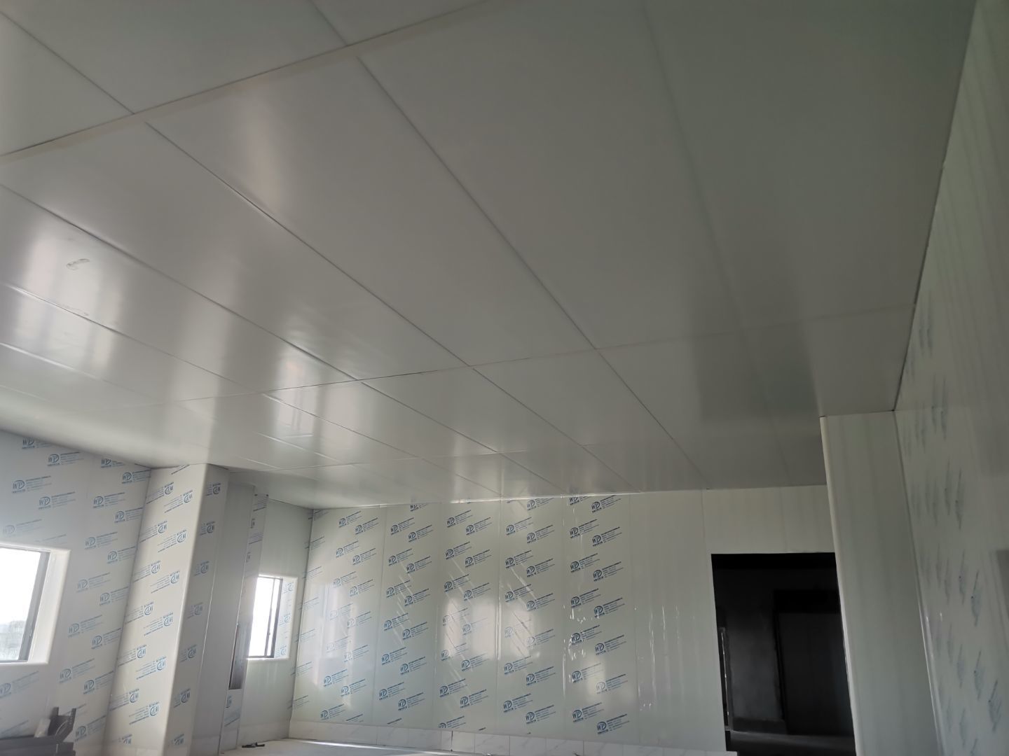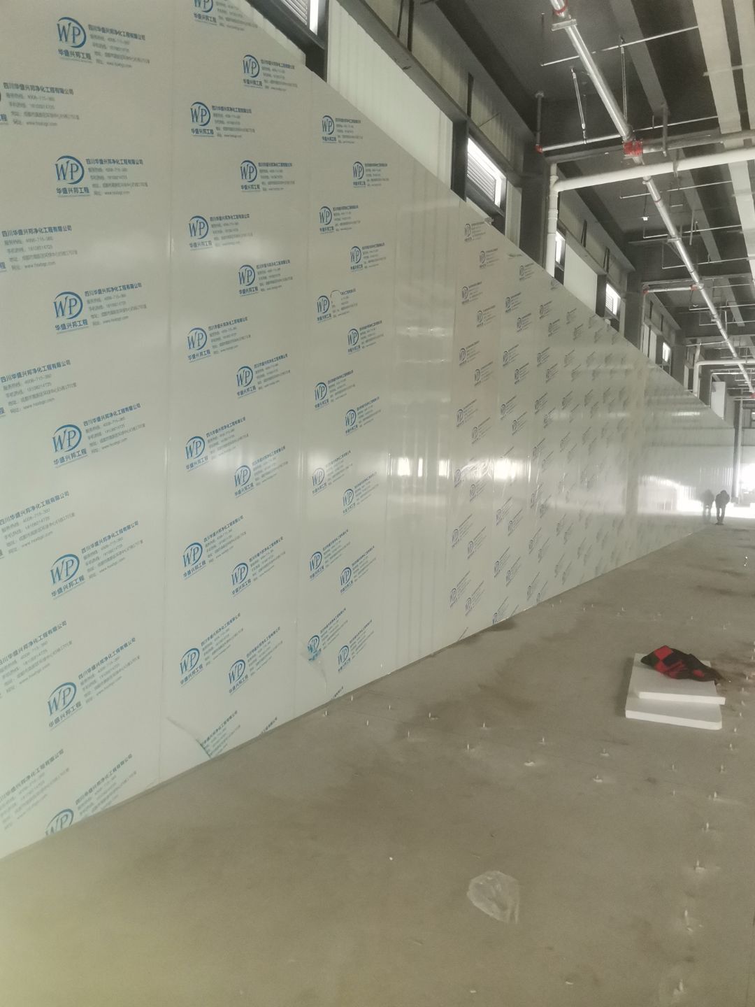 1、擋水墻貼磚完成95%(剩余吊裝口完成后實(shí)施); 2、凍庫庫板安裝完成100%,頂板完成100%; 3、低溫庫加熱絲安裝完成100%,保護(hù)層完成100%,擠塑板完成100%,凍庫地面混凝土澆筑完成100%,切縫完成,養(yǎng)護(hù); 3、彩鋼板安裝完成85%; 4、頂板安裝完成85%; 5、實(shí)驗(yàn)室墻板頂板完成100%; 6、化驗(yàn)室墻板頂板完成100%; 7、工具間墻板完成100%。