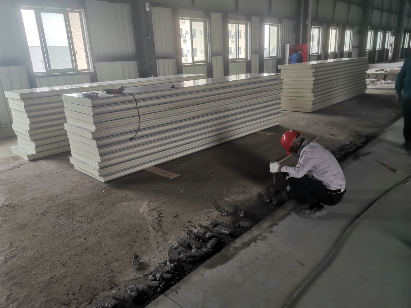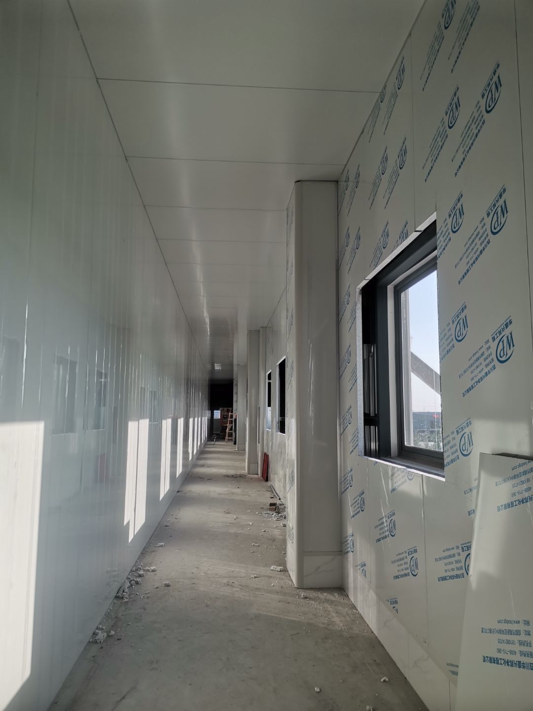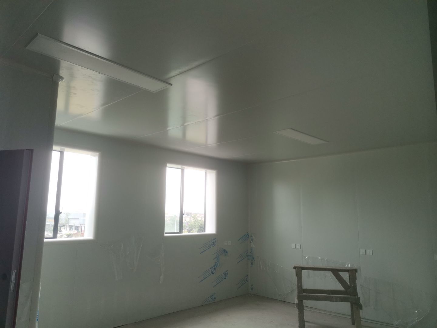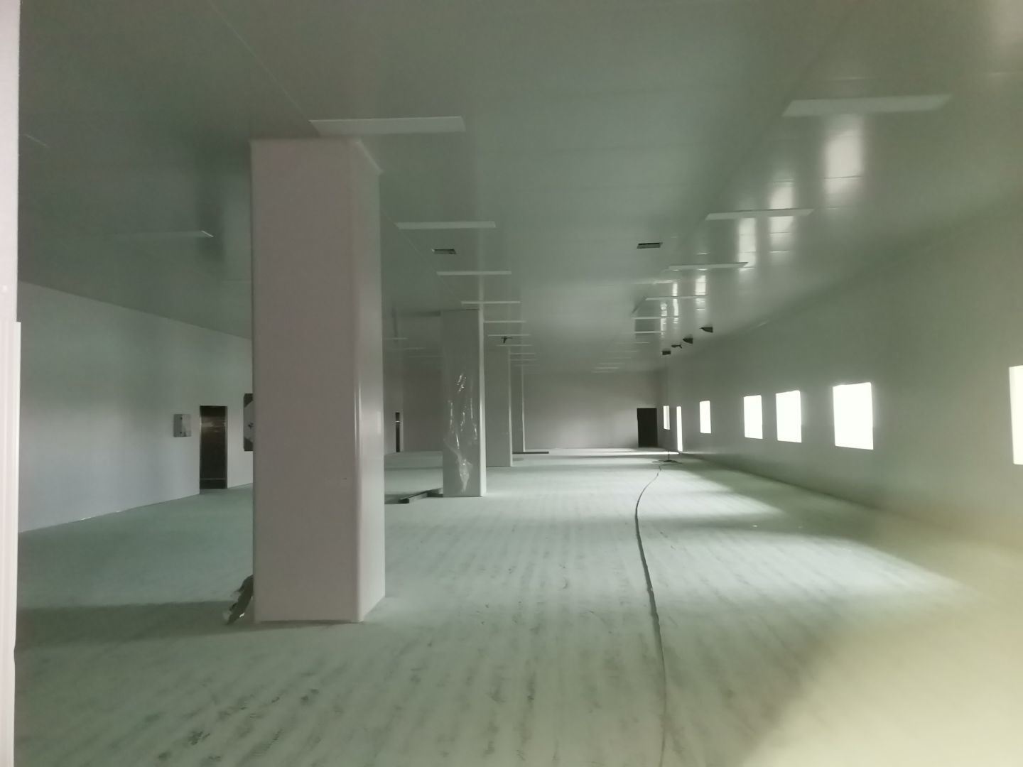 1、擋水墻貼磚完成95%(剩余吊裝口完成后實(shí)施); 2、凍庫庫板安裝完成100%,頂板完成100%; 3、低溫庫加熱絲安裝完成100%,保護(hù)層完成100%,擠塑板完成100%,凍庫地面混凝土澆筑完成100%,切縫完成,養(yǎng)護(hù); 3、彩鋼板安裝完成85%; 4、頂板安裝完成85%; 5、實(shí)驗(yàn)室墻板頂板完成100%; 6、化驗(yàn)室墻板頂板完成100%; 7、工具間墻板完成100%。