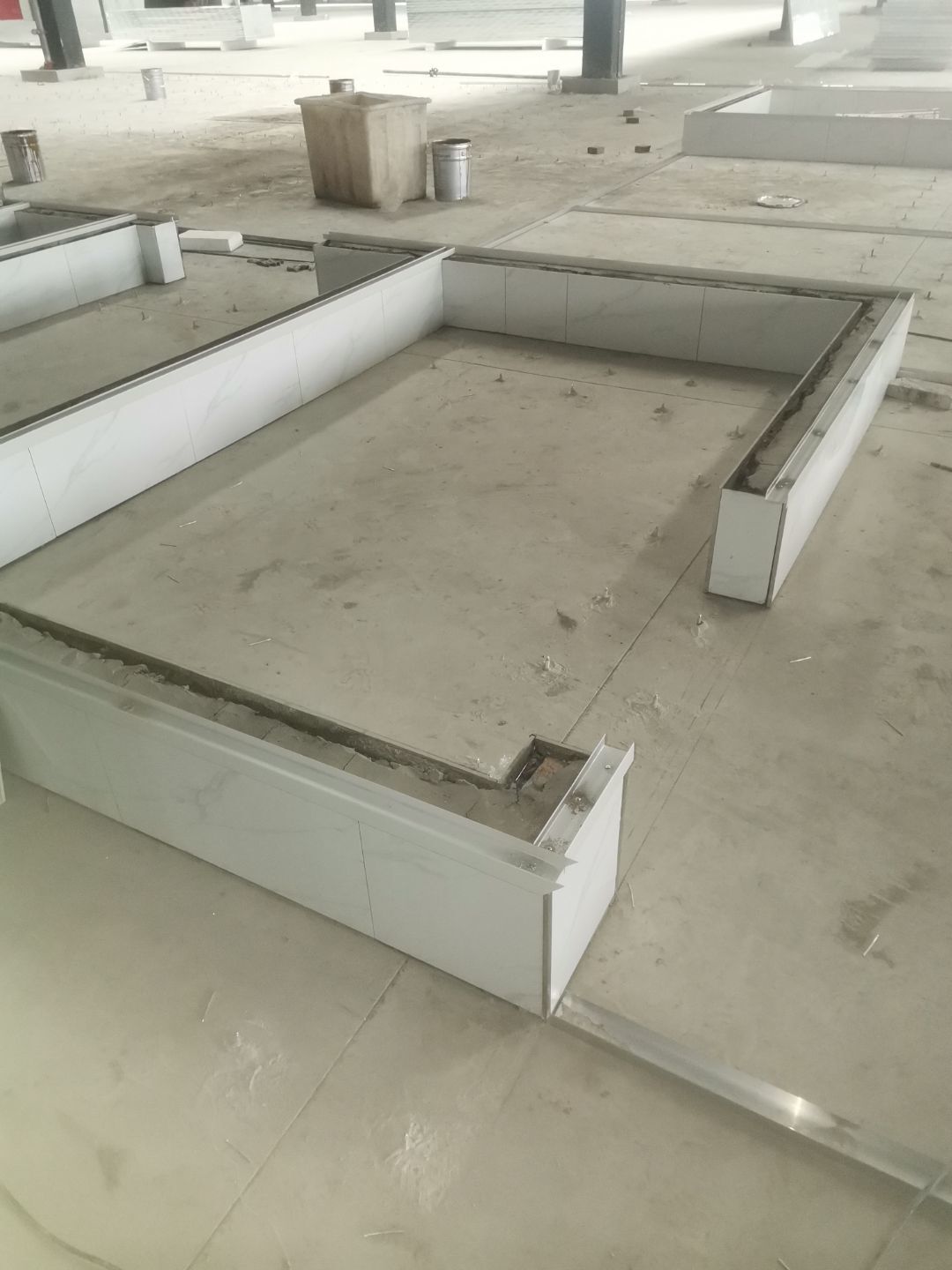 1、擋水墻貼磚完成90%(剩余待凍庫安裝完成后實(shí)施); 2、凍庫庫板安裝完成100%; 3、地坪修補(bǔ)注漿鉆孔完成100%; 4、注漿加固完成100%; 5、彩鋼板安裝完成75%; 6、地槽安裝完成100%; 7、排水孔開洞完成100%。