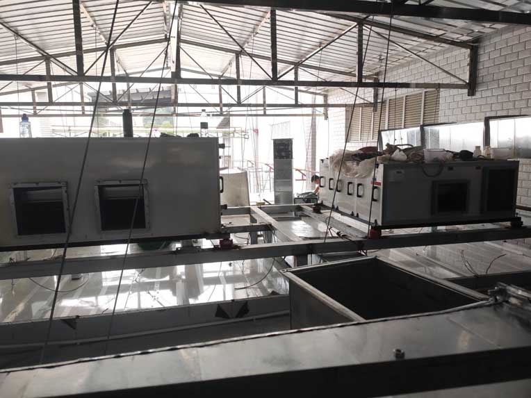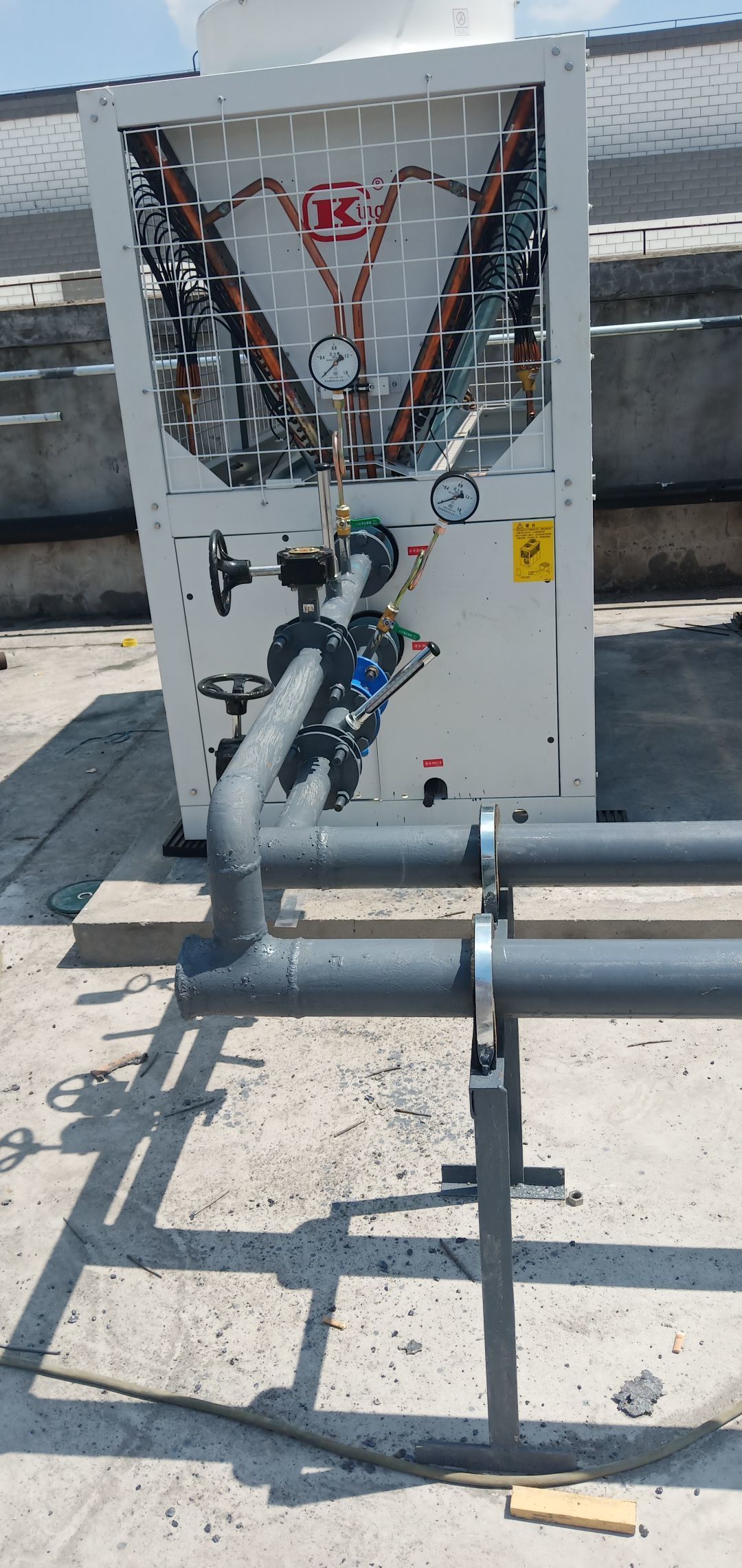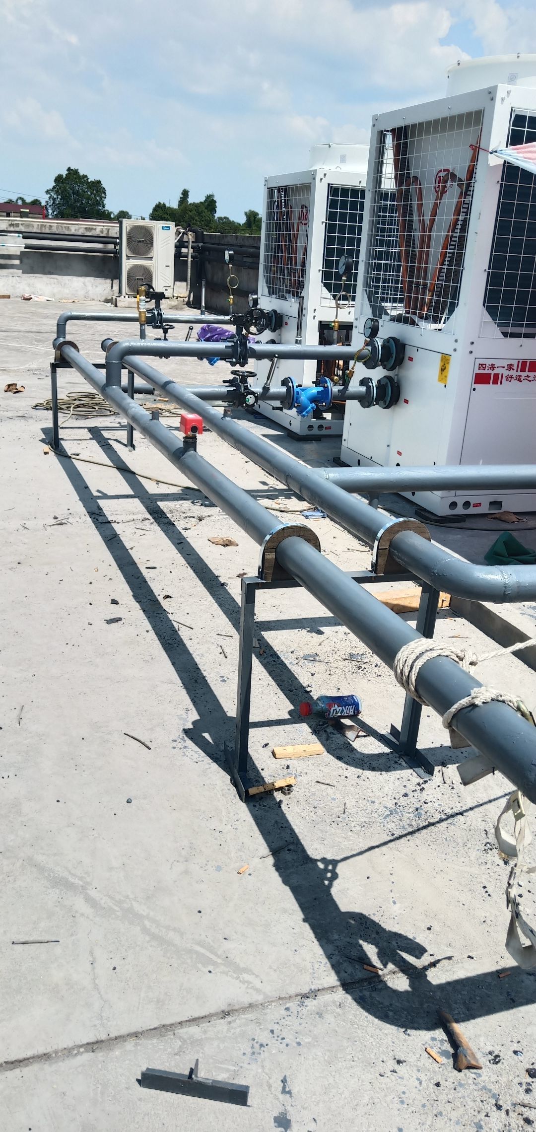 內(nèi)包間、脫硫間空調(diào)內(nèi)機(jī)安裝完成,屋面空調(diào)主機(jī)安裝完成,水管安裝完成50%,風(fēng)管安裝完成70%,風(fēng)口開孔完成60% 彩鋼墻板、頂板完成90%,圓弧、膠水完成90% 水電完成50%