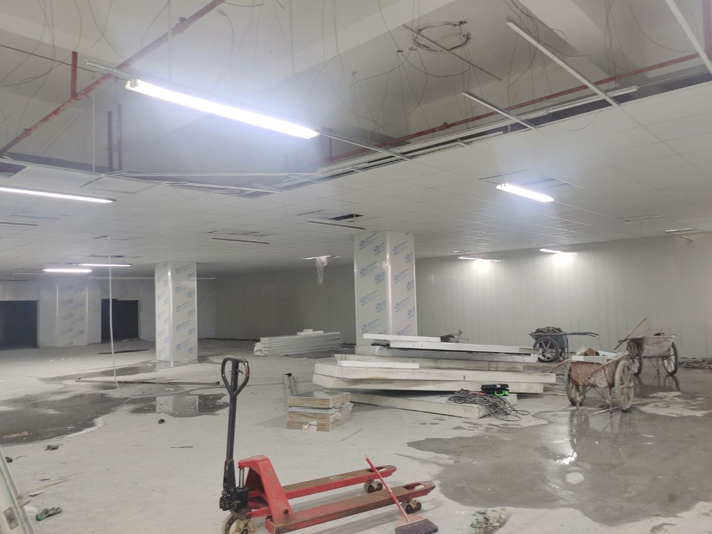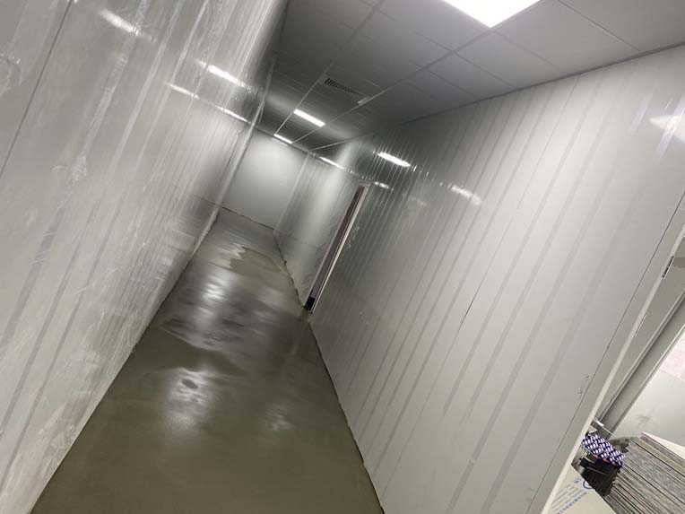 1、辦公司隔墻安裝完成,開(kāi)門洞及門制作安裝完成 2、外包間墻面板安裝完成90%,剩余部分甲方要求設(shè)備搬運(yùn)后安裝
