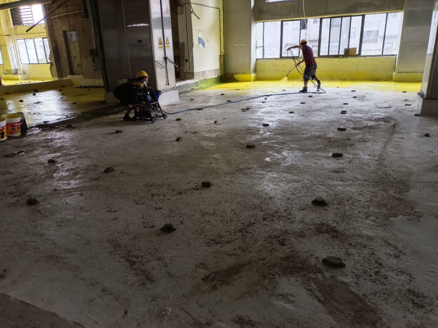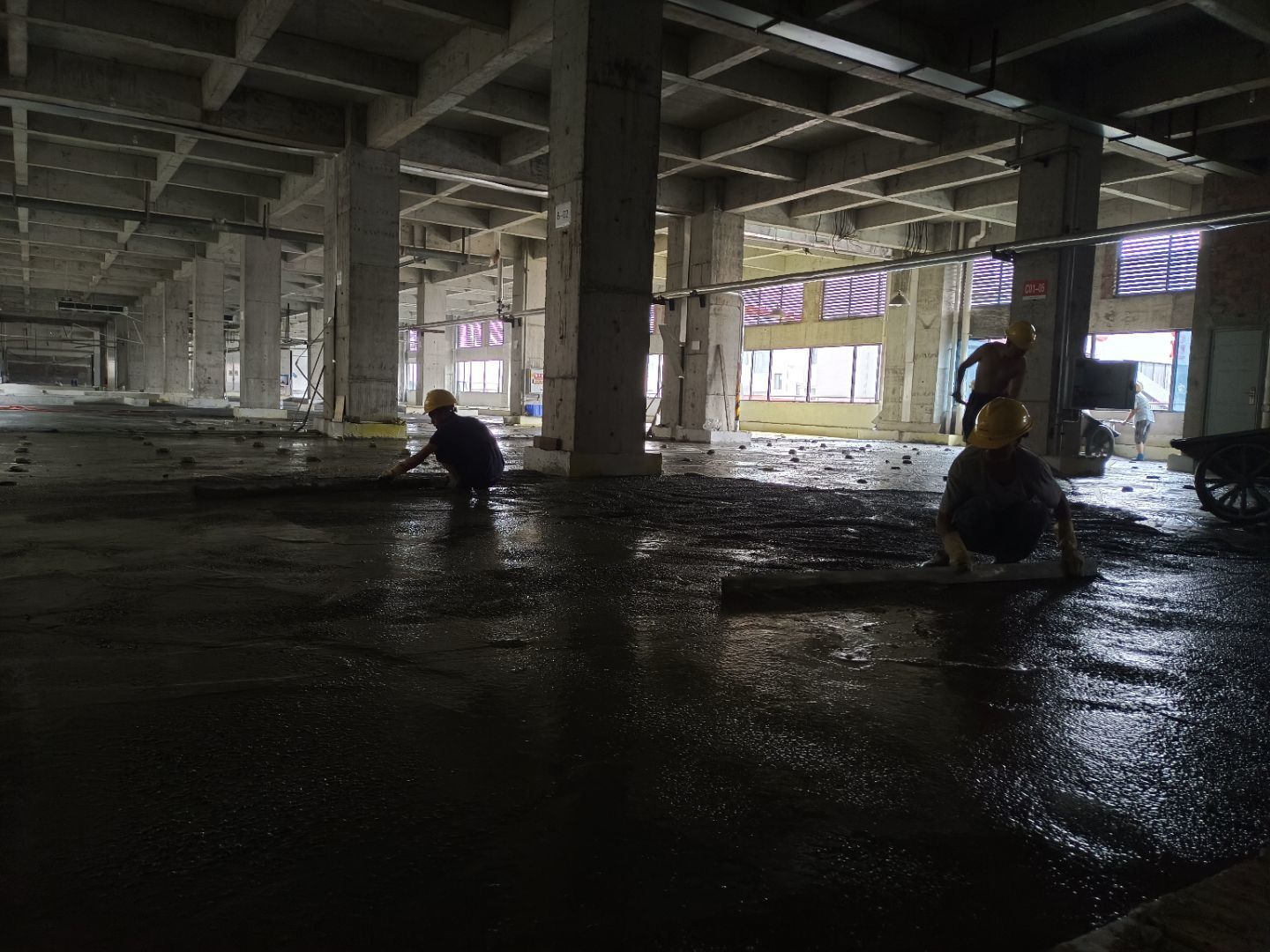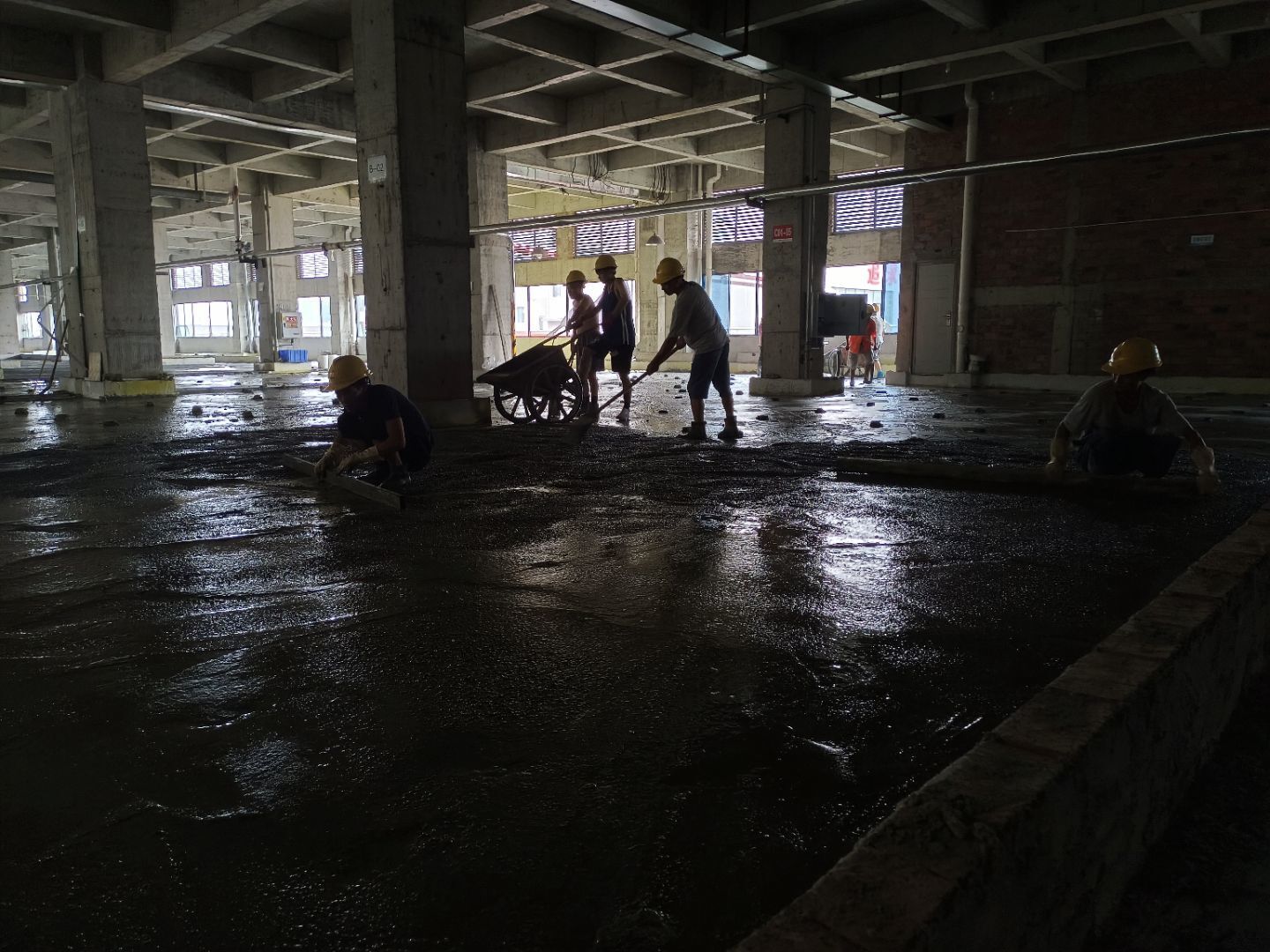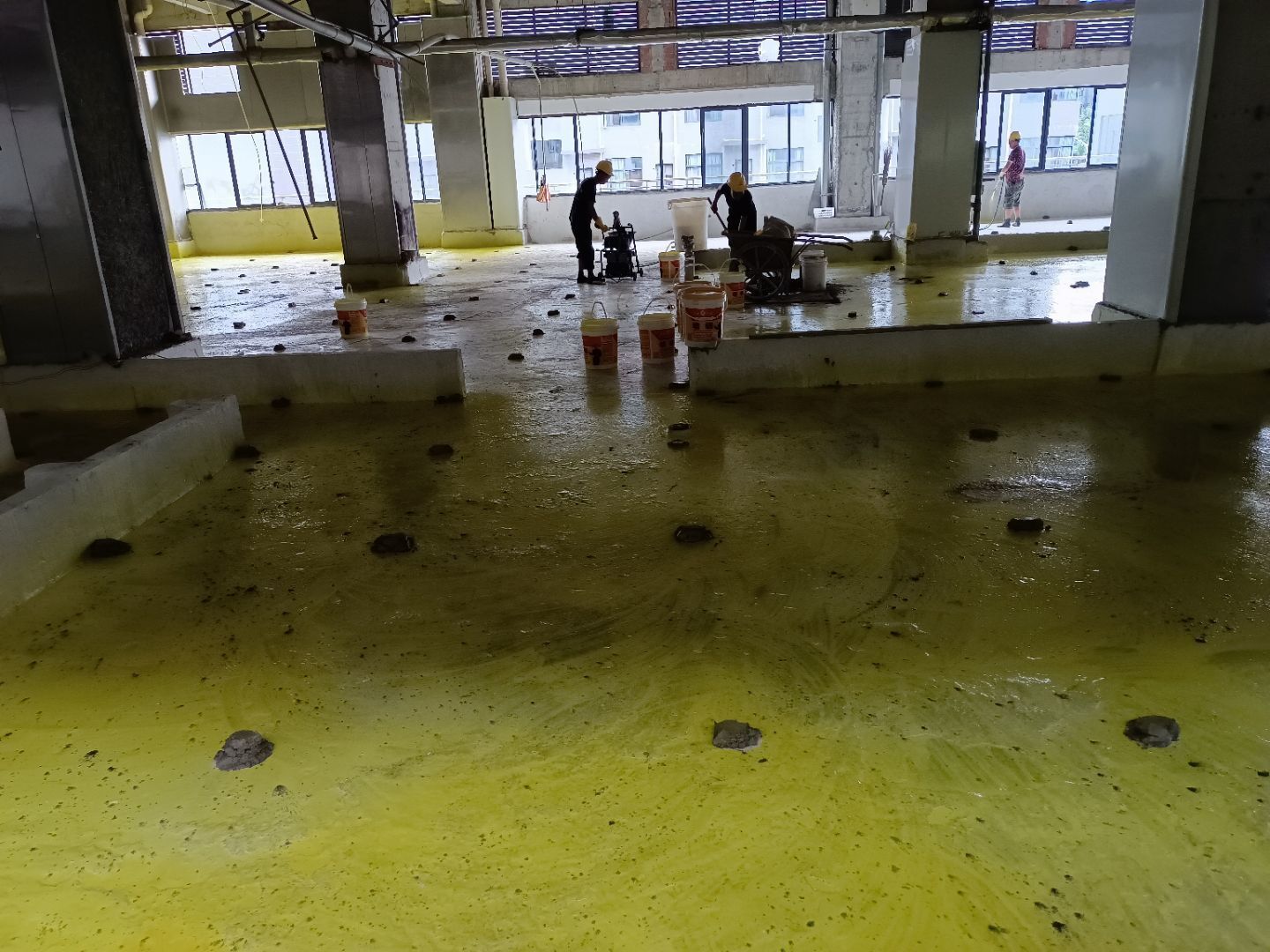 水磨石地坪施工,水磨石鋪漿完成75%;