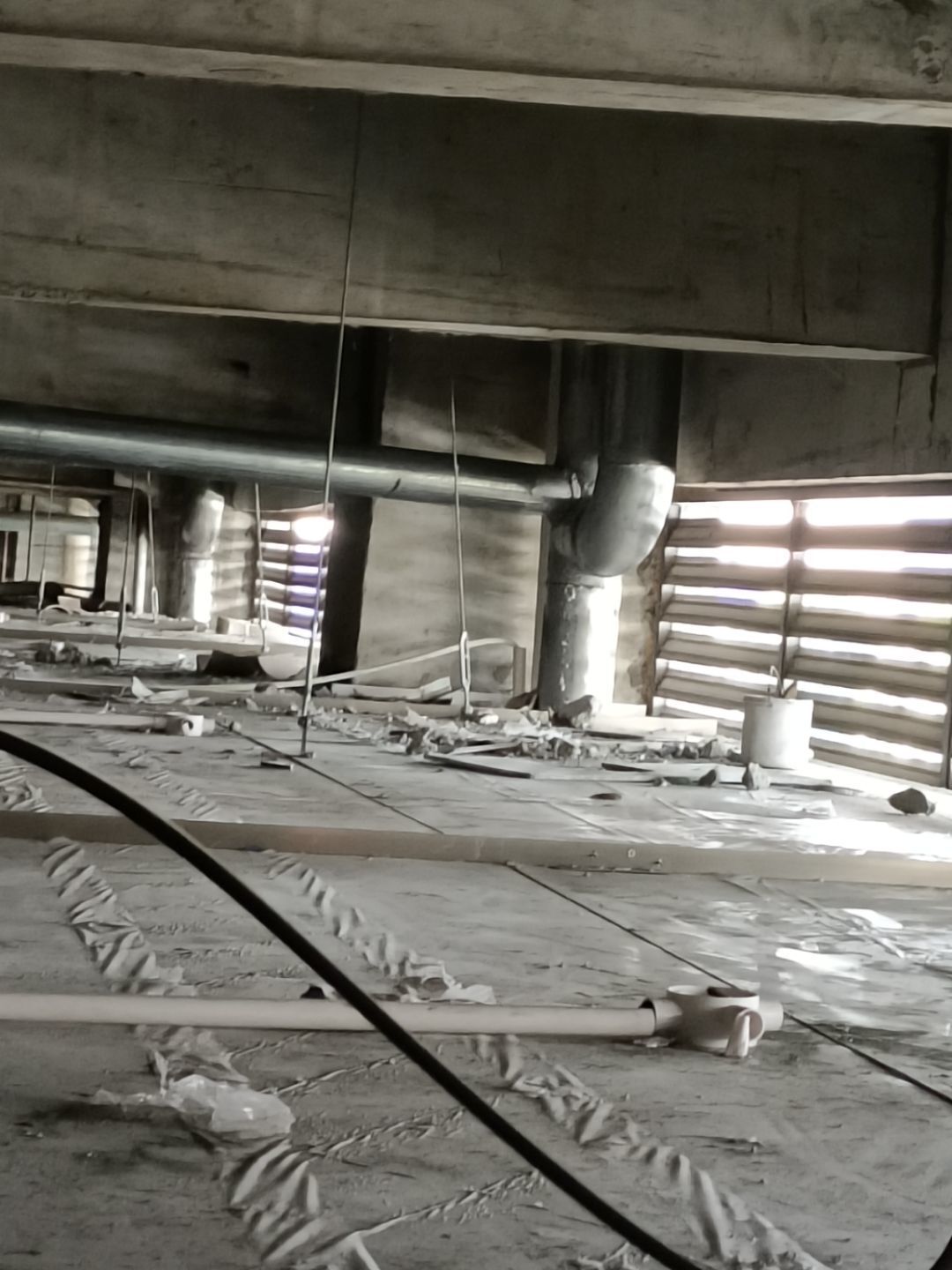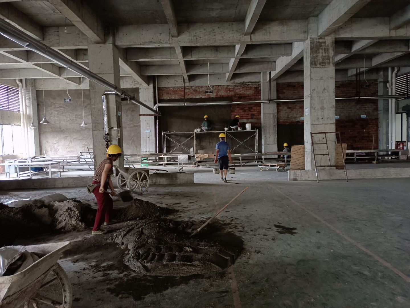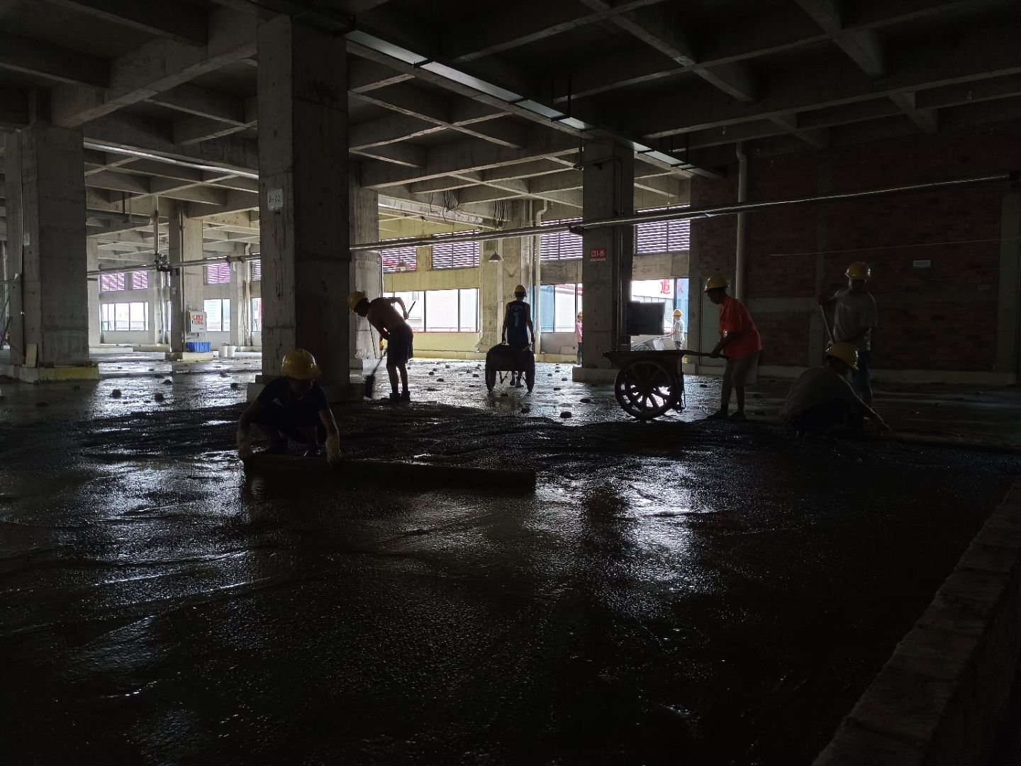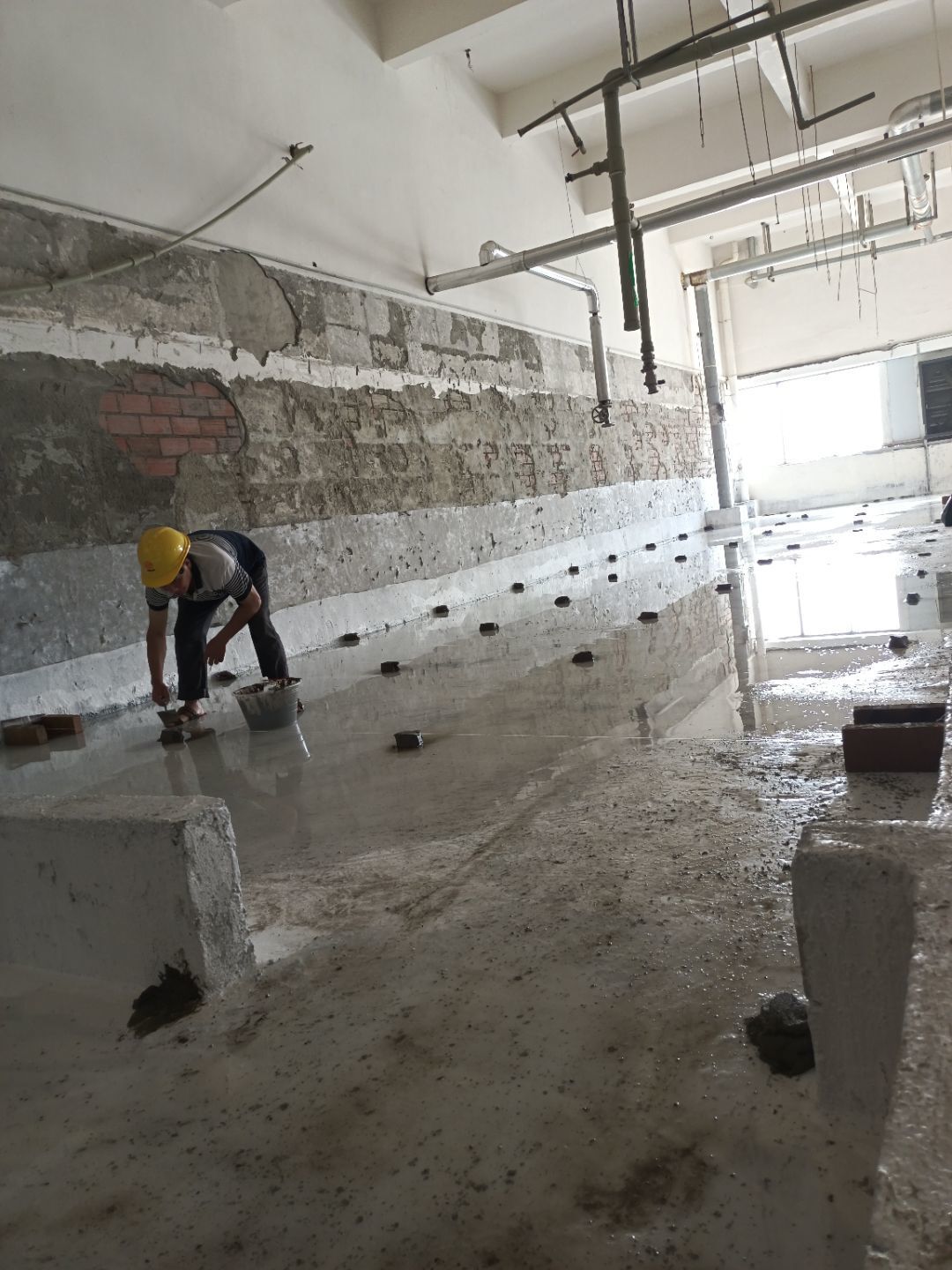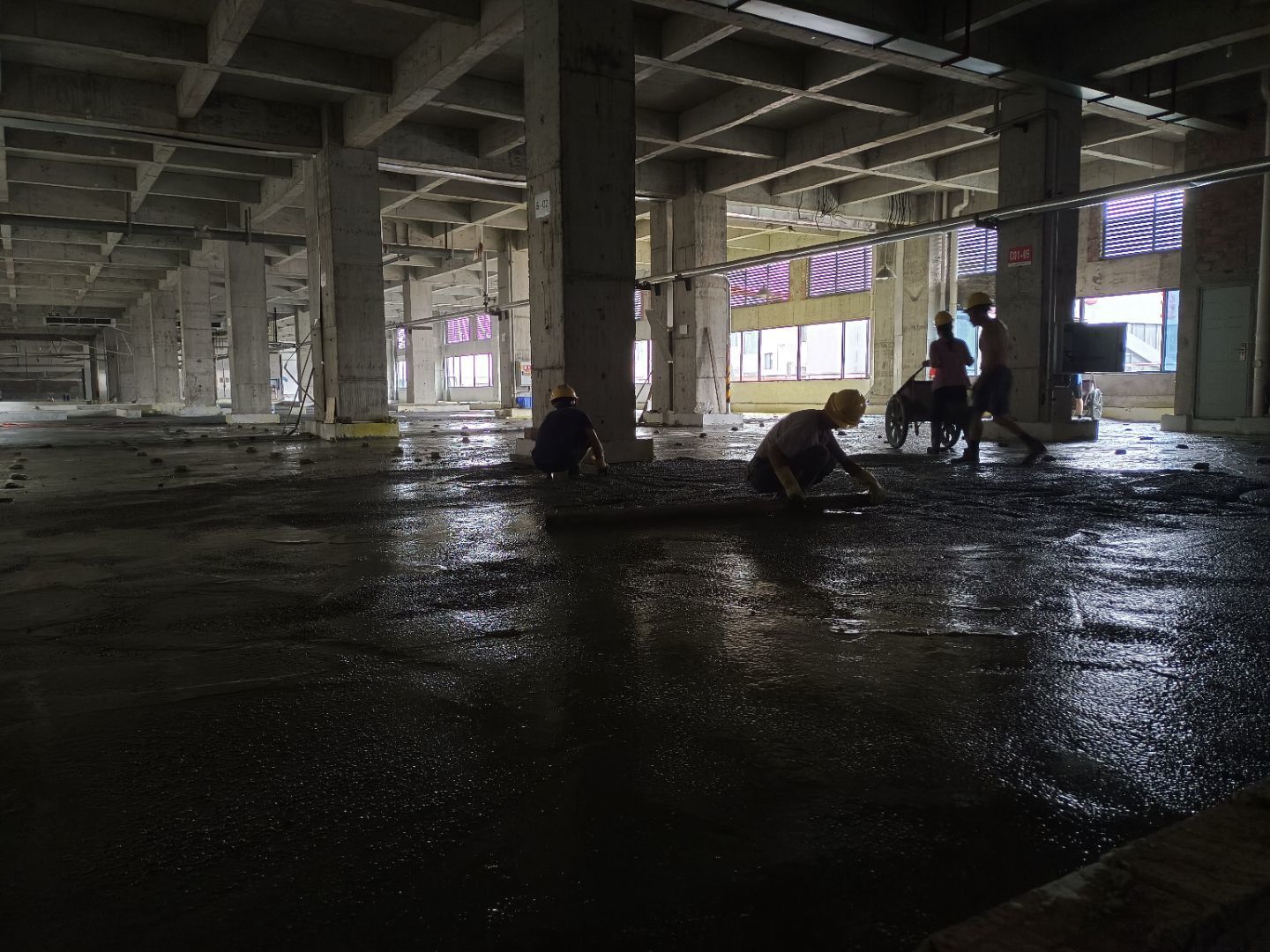 水磨石地坪施工,水磨石鋪漿完成75%;