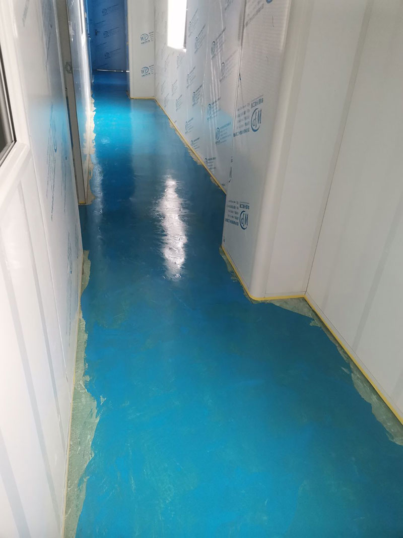 1.頂板安裝完成100%; 2.三防板吊頂完成100%; 3.水電安裝完成100%,燈具安裝完成100%; 4.新增動力電完成100%; 5.衛生間隔墻完成100%; 6.腳踏池完成100%; 7.風淋室制作完成100%; 8.地坪膩子層完成100%; 9.板縫及地面縫隙處理完成70%; 10.場地清理。