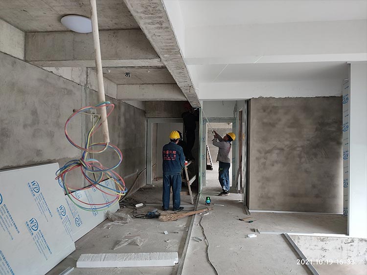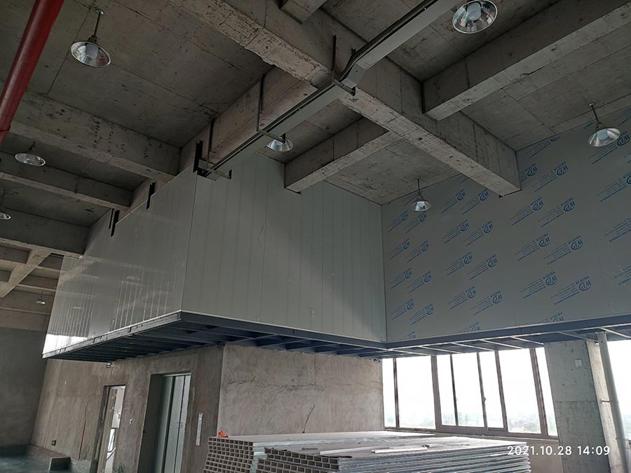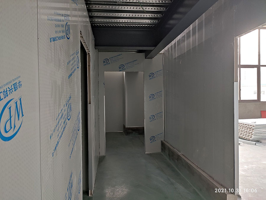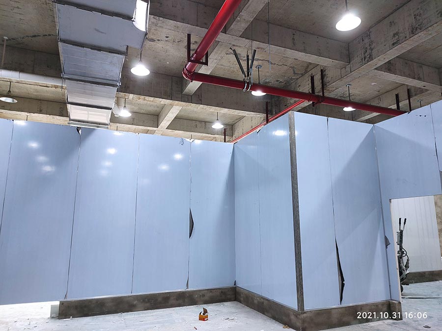 工程進(jìn)度: 1,一樓鋼平臺彩鋼隔墻完成50% 2,二樓更衣區(qū)過道頂板完成 3,3樓頂板吊桿安裝完成80% 4,電工進(jìn)場,點位繪制并跟甲方確認(rèn)完成3,4樓