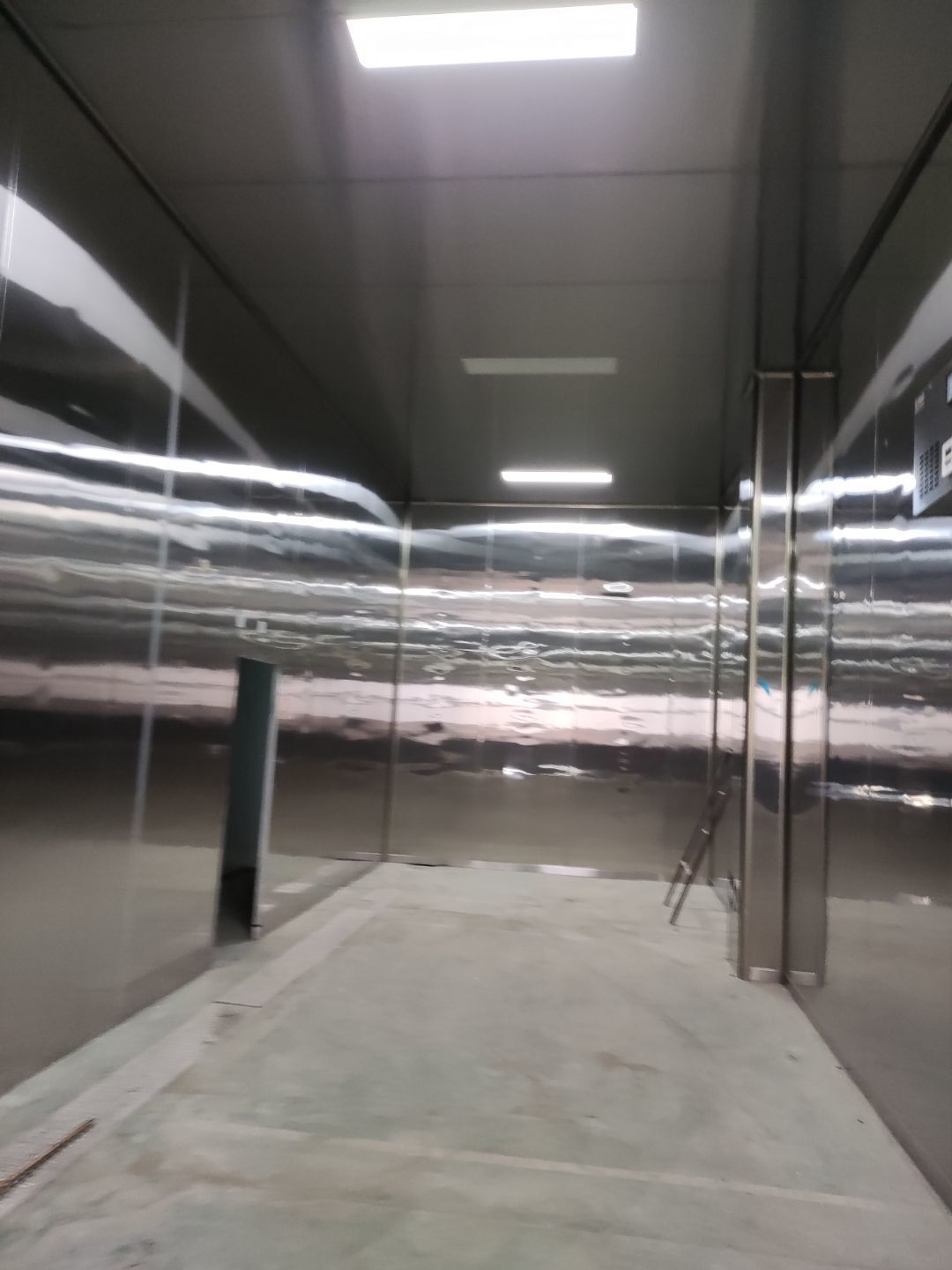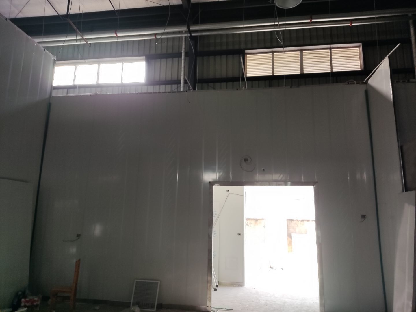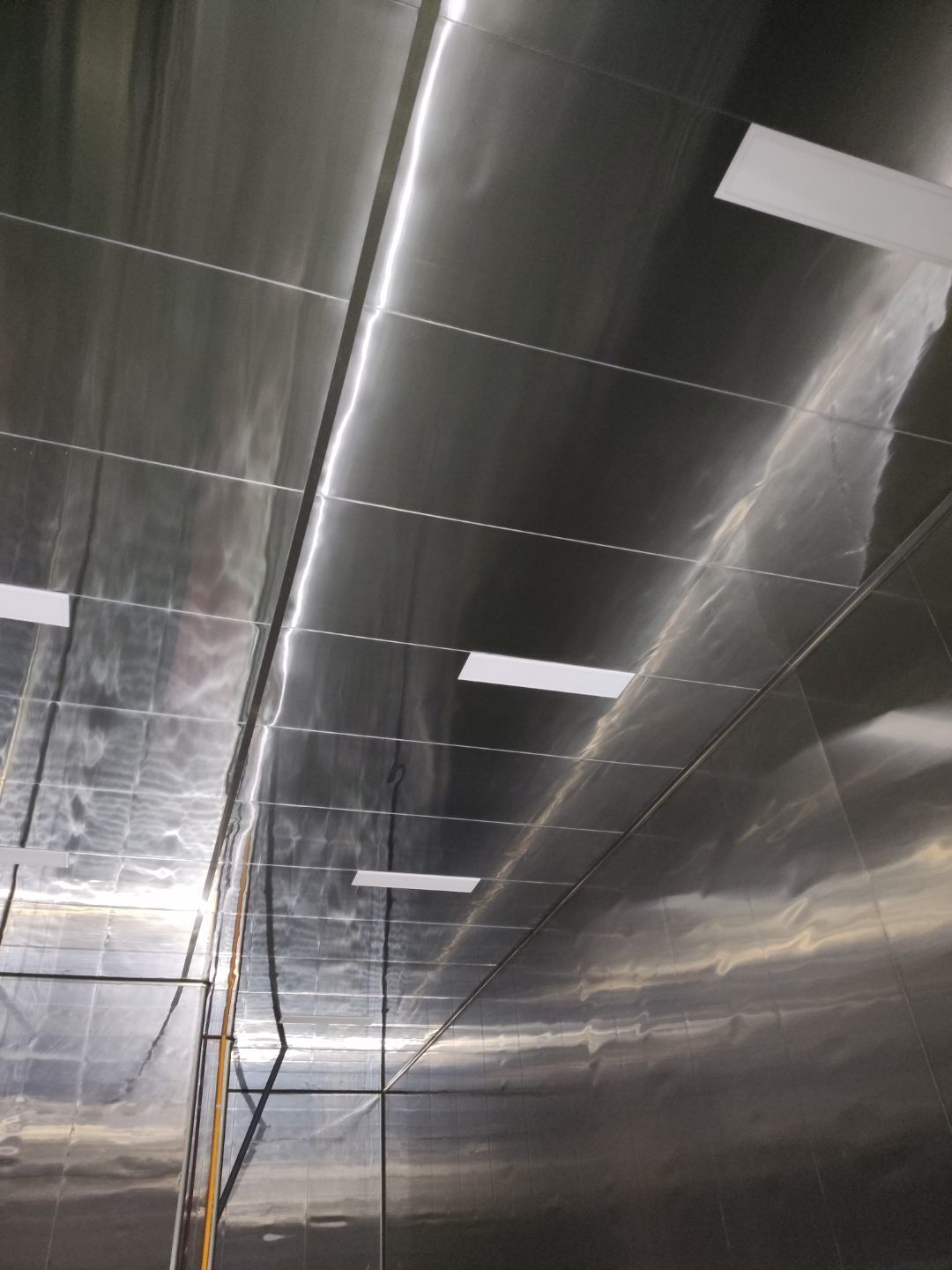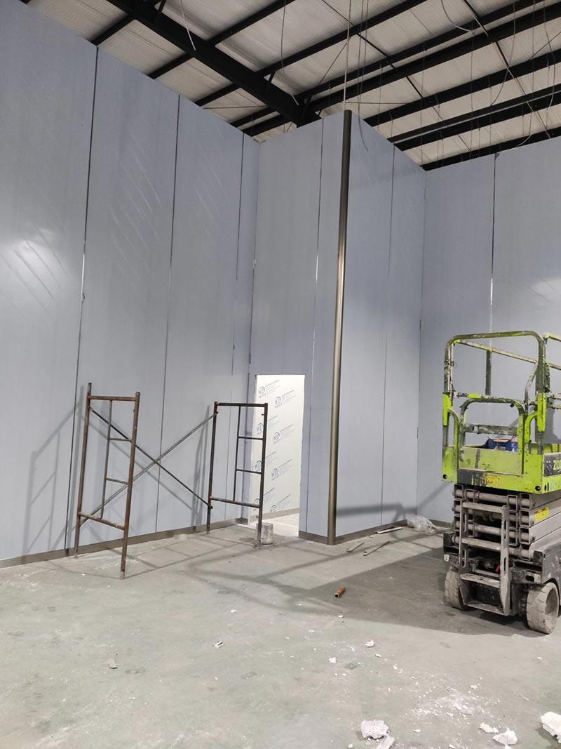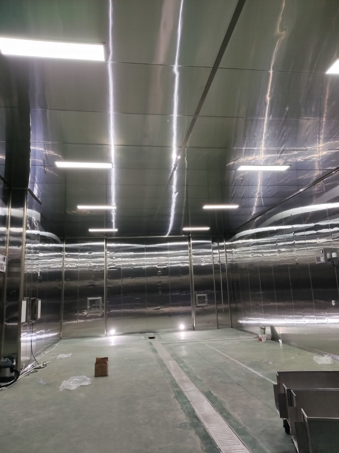 通道、脫包間、配料間墻板和頂板安裝完成,內包間包柱子完成。普通燈具安裝完成15%,開關插座開孔配管完成。
