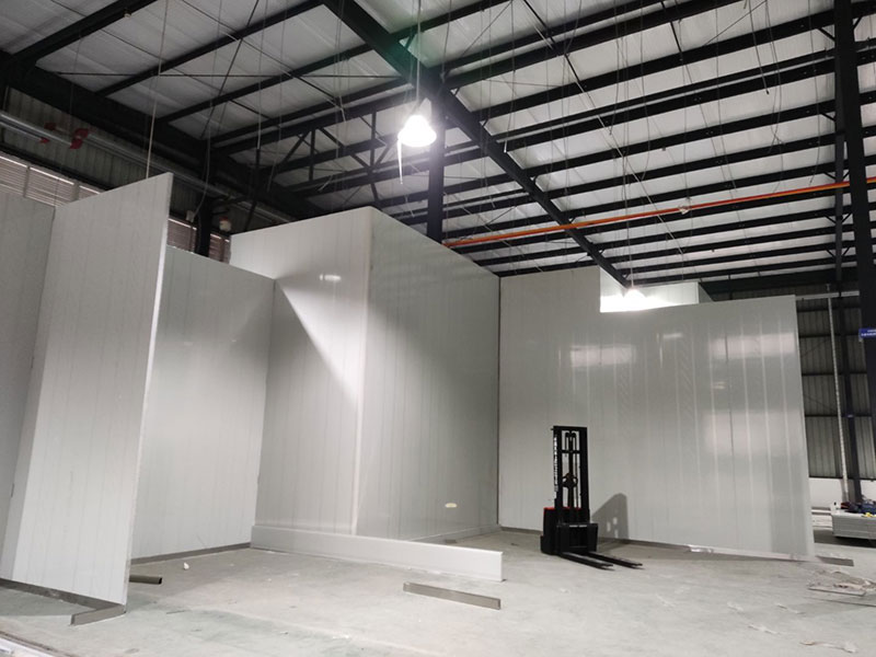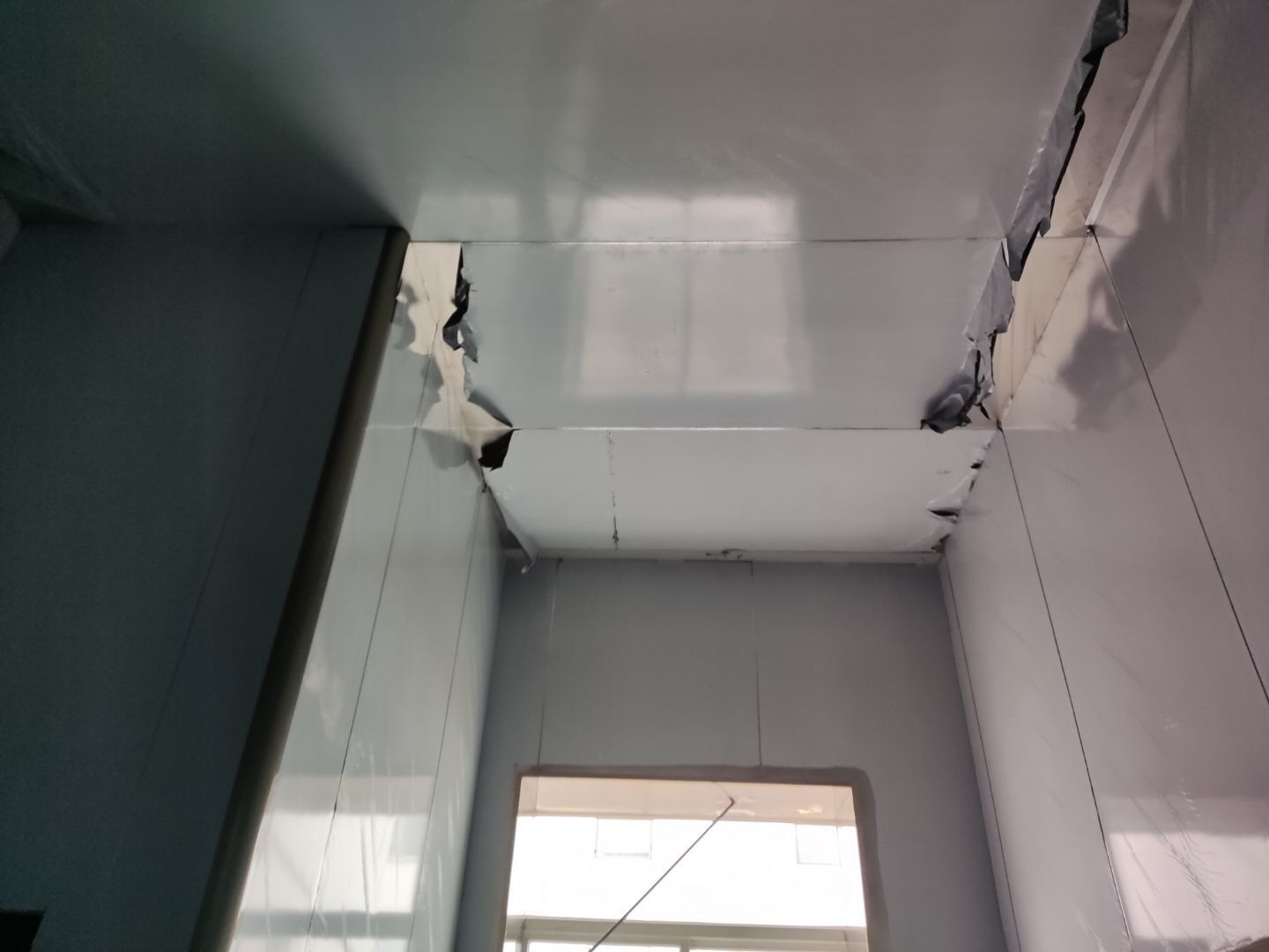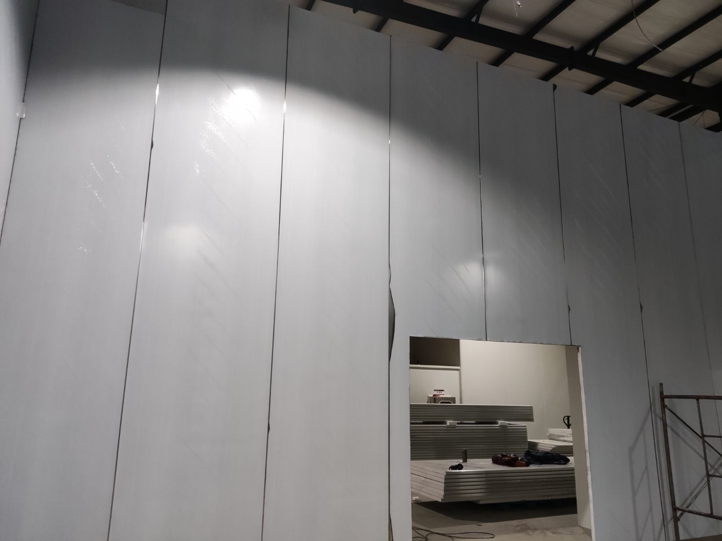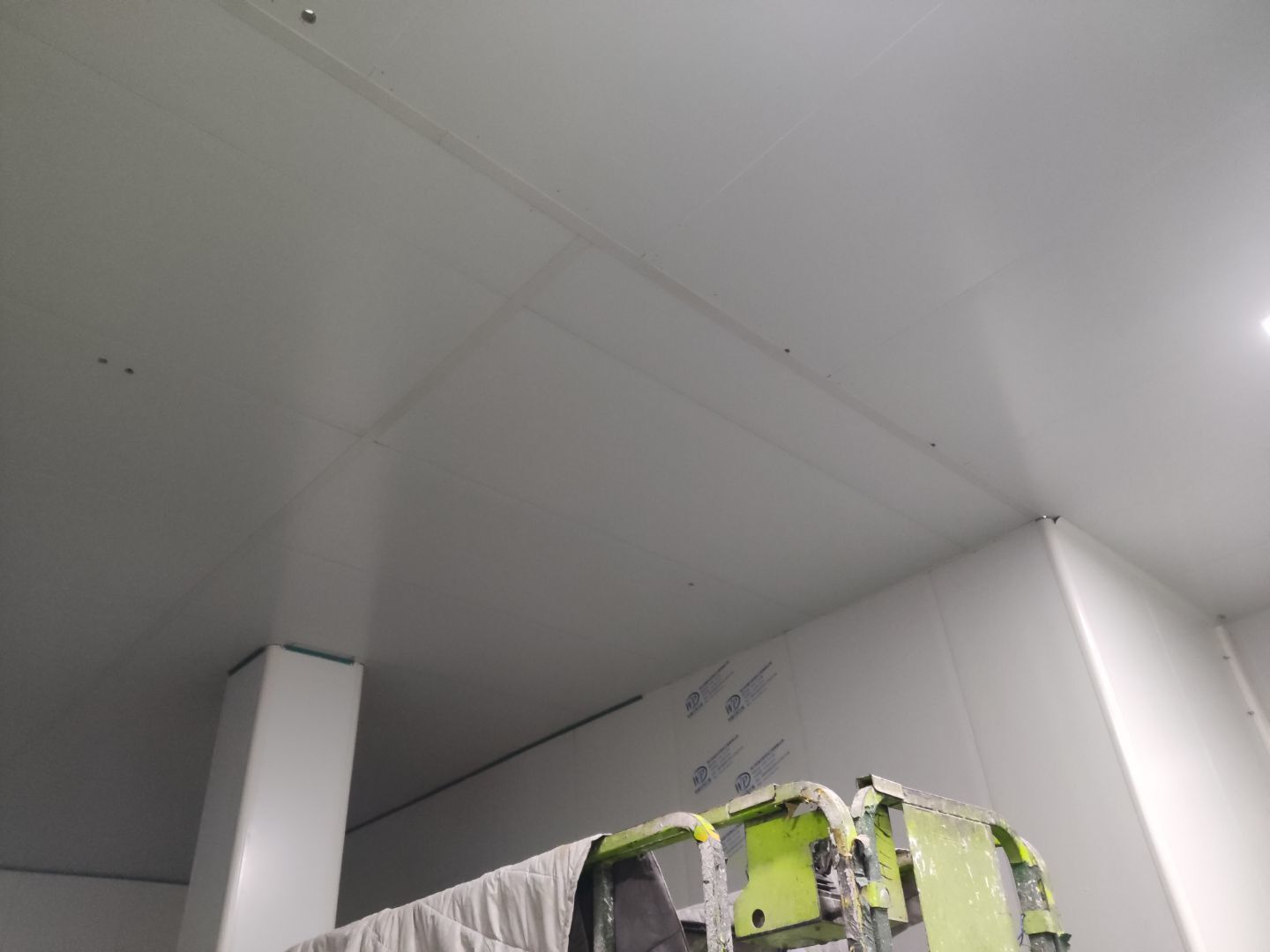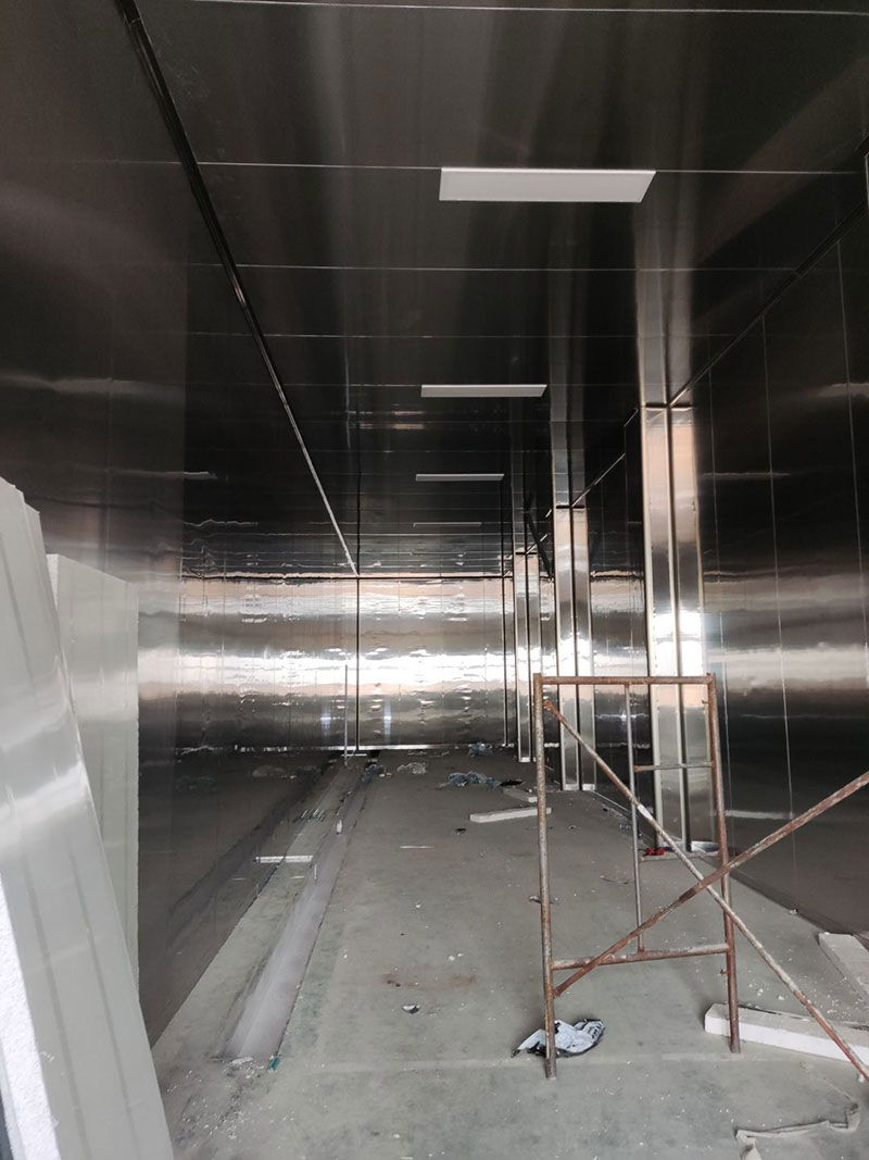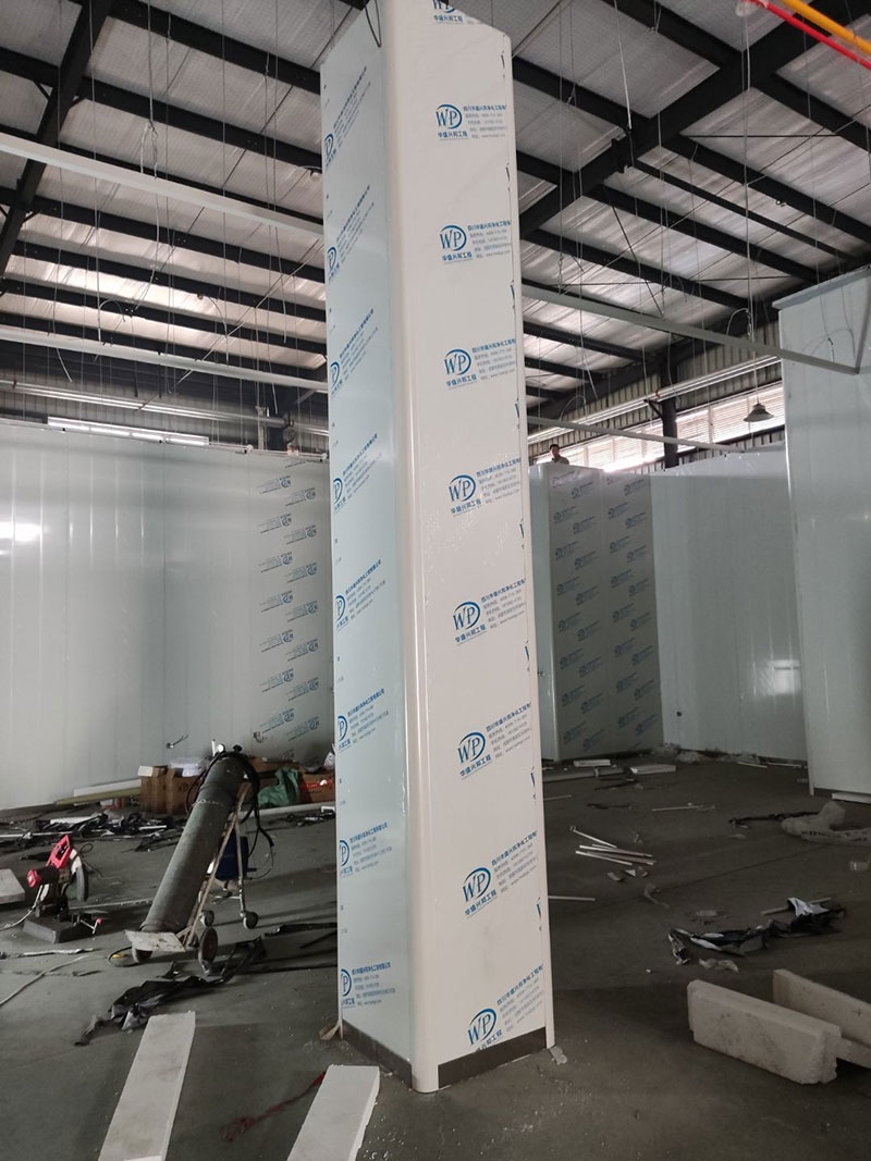 通道、脫包間、配料間墻板和頂板安裝完成,內包間包柱子完成。普通燈具安裝完成15%,開關插座開孔配管完成。
