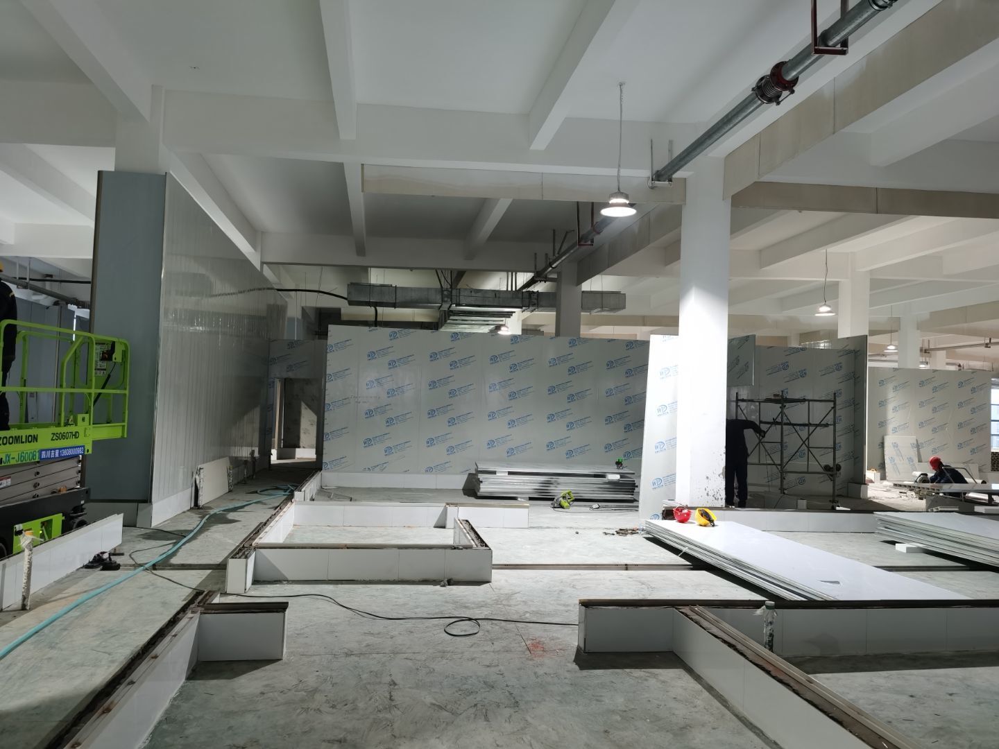 ①擋水墻主體施工第7天,完成擋水墻進度65%,擋水墻暫停進度,等待下一步工藝進行 ②防水進場施工第15天,防水進度完成100% ③排水管師傅進場施工第10天,室內排水管及排水點位完成100%室外排水管完成進度100% ④室內排水暗管找坡完成進度100% ⑤凍庫防水完成100% ⑥發泡混凝土進場施工第5天,進度完成100% ⑦等待黃色預警解出通知,準備下一歨工藝流程