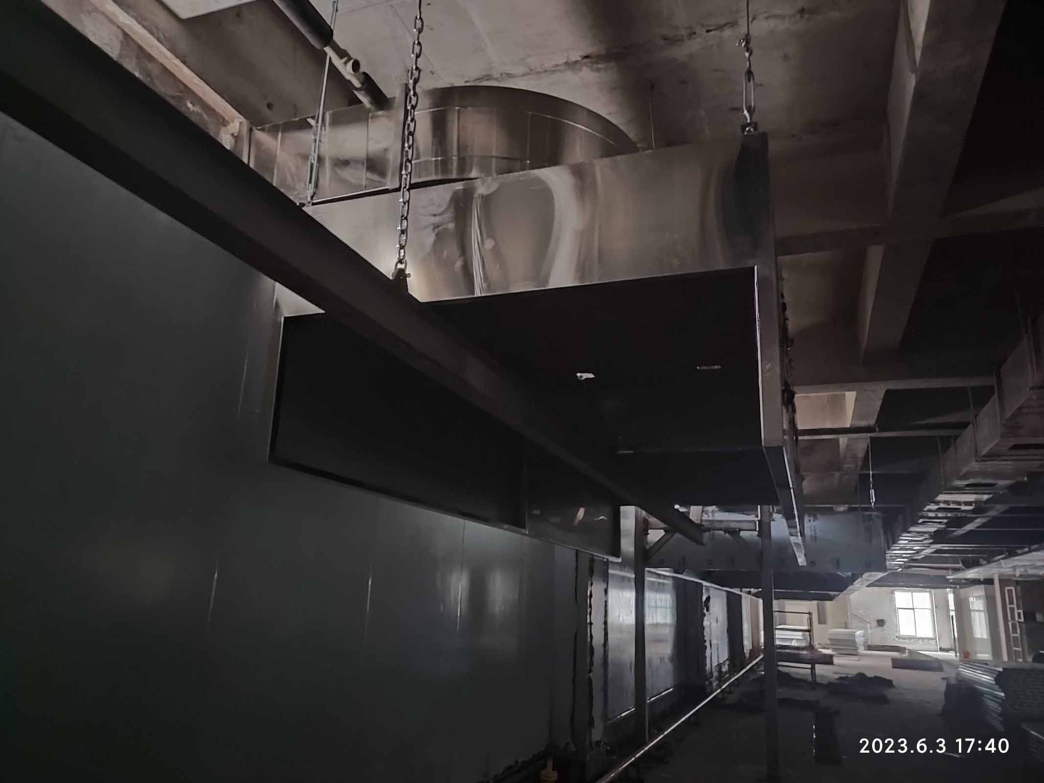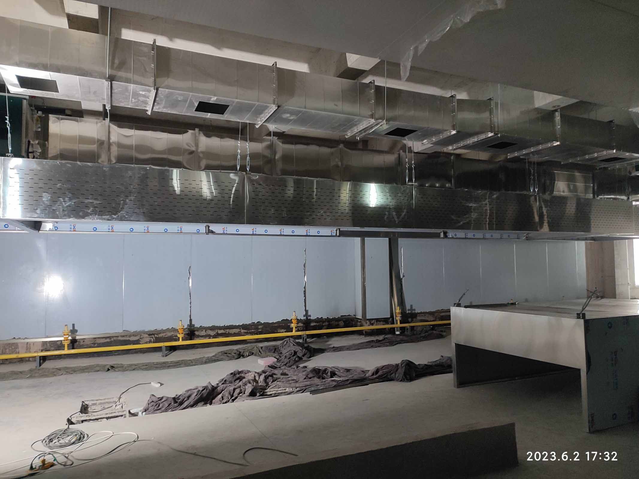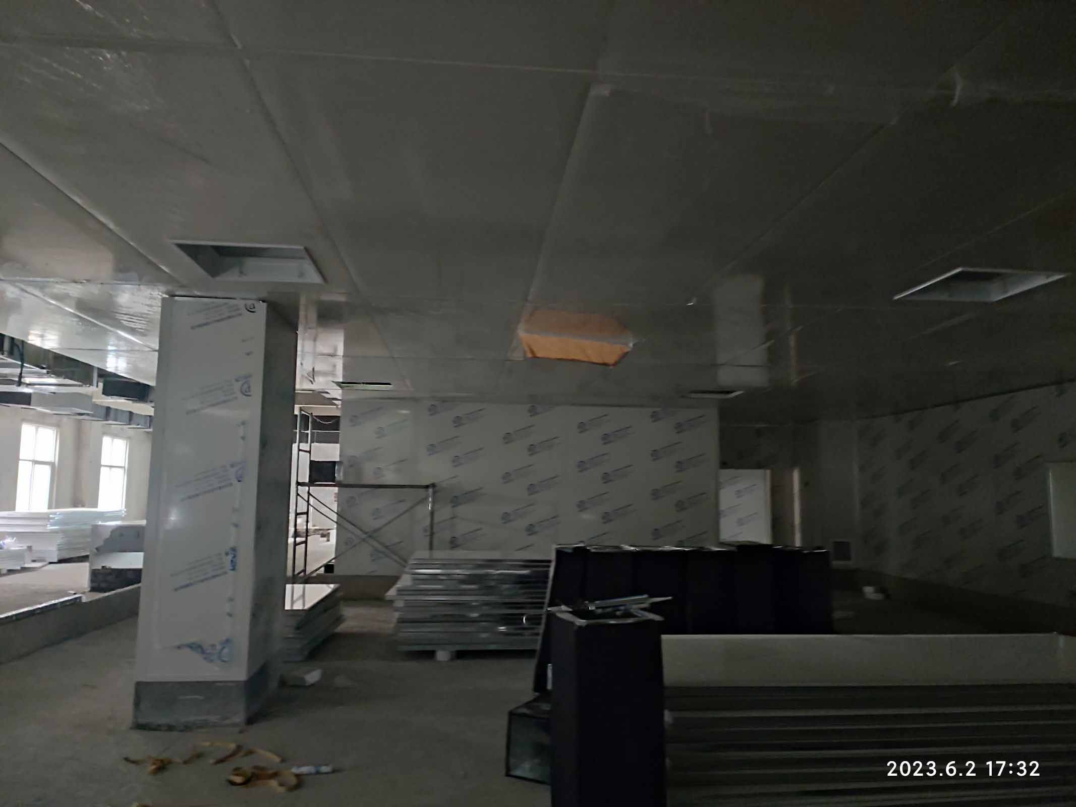 ①、第二批凈化風管吊裝完成85%,末端風管組裝完成70%; ②、將昨日來貨頂板搬運分配至各房間完成; ③、接屋面與設備連接的風管組裝完成90%,二樓熱加工間煙罩吊裝完成80%,明日全部吊裝完成; ④、一樓凍庫排管銅管連接完成40%。