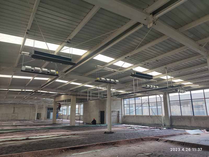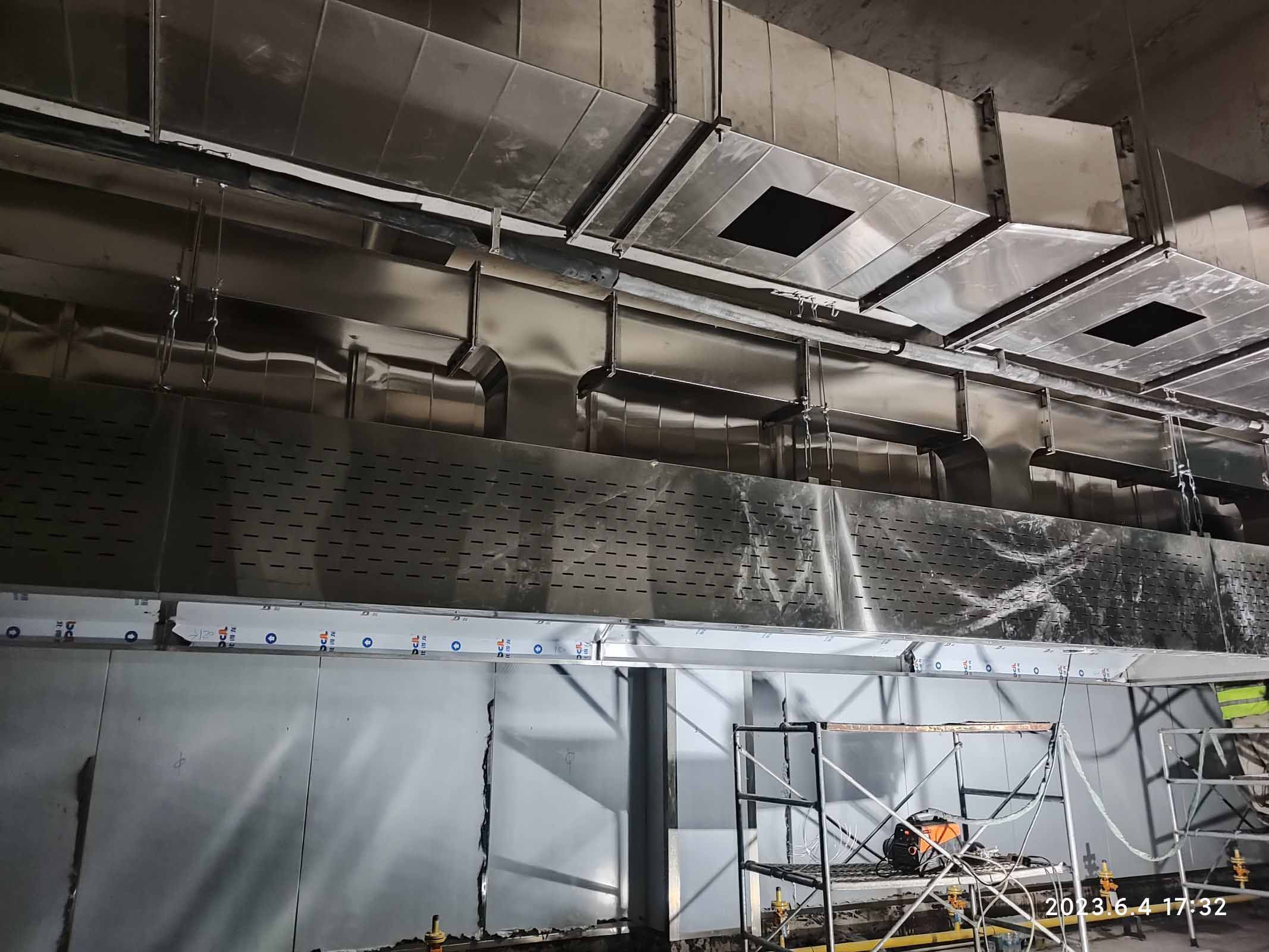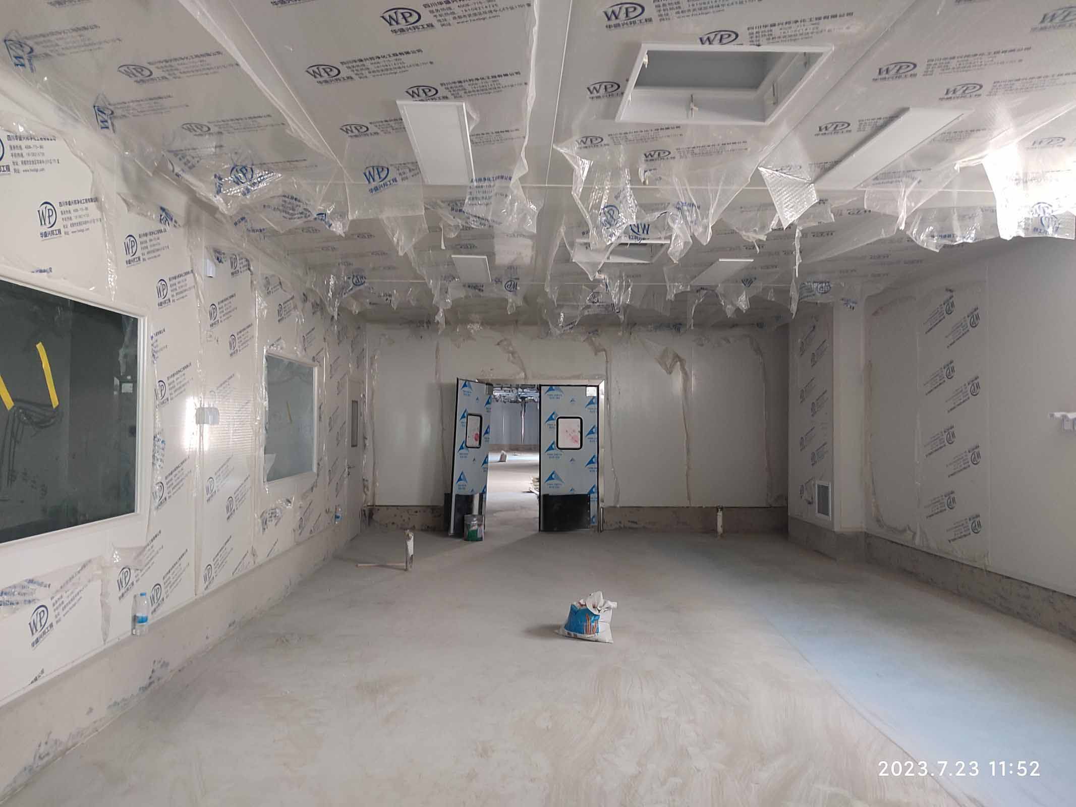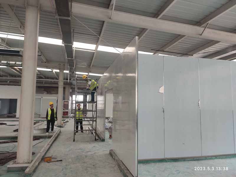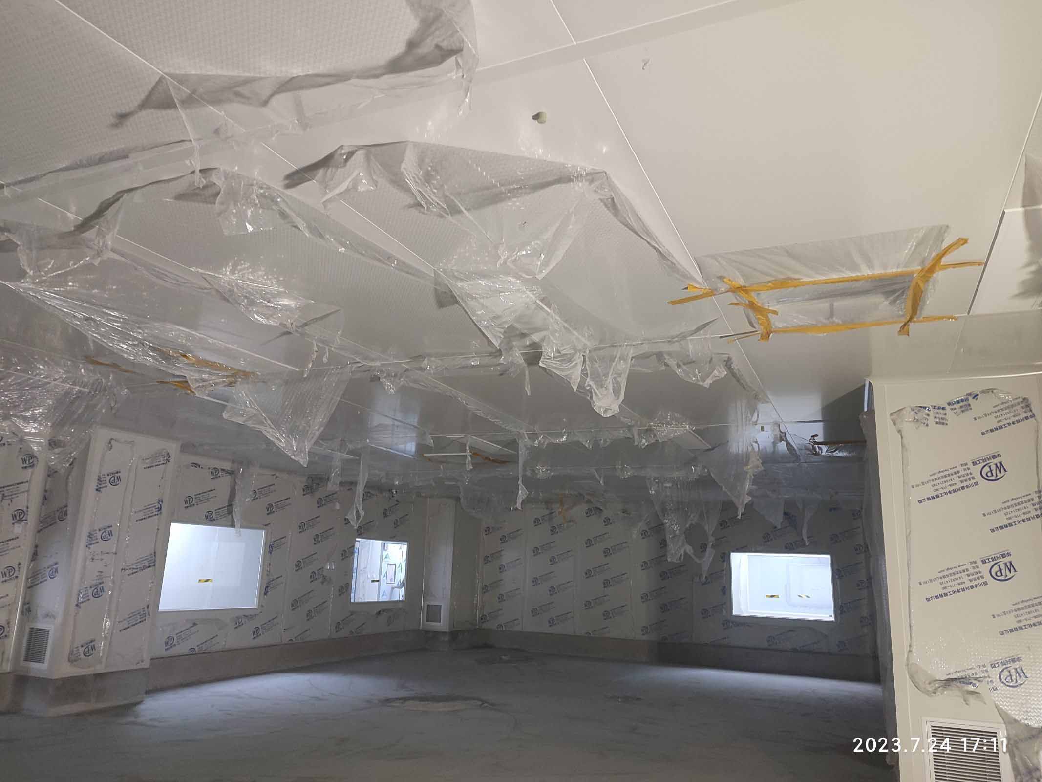 ①、第二批凈化風管吊裝完成85%,末端風管組裝完成70%; ②、將昨日來貨頂板搬運分配至各房間完成; ③、接屋面與設備連接的風管組裝完成90%,二樓熱加工間煙罩吊裝完成80%,明日全部吊裝完成; ④、一樓凍庫排管銅管連接完成40%。