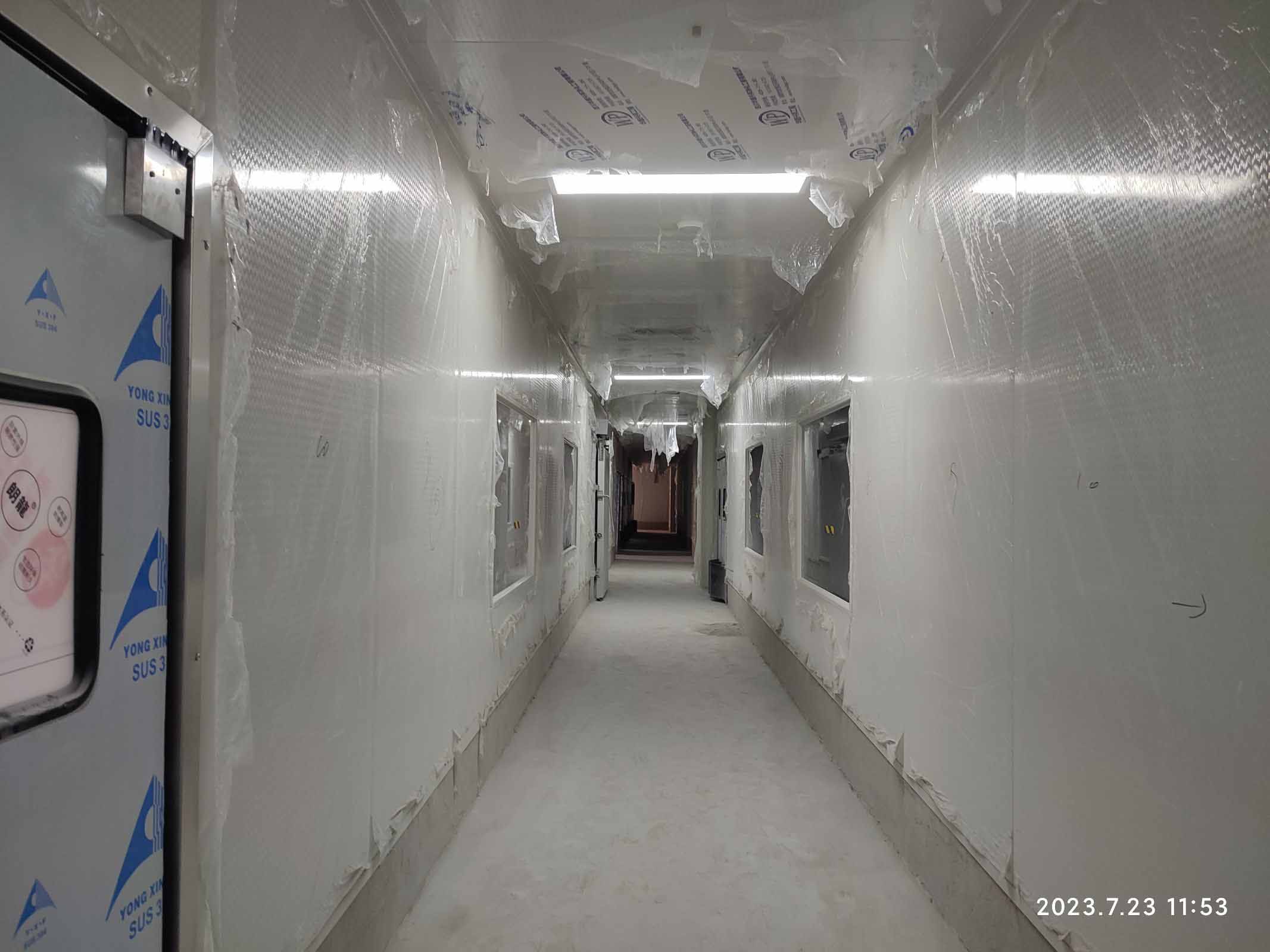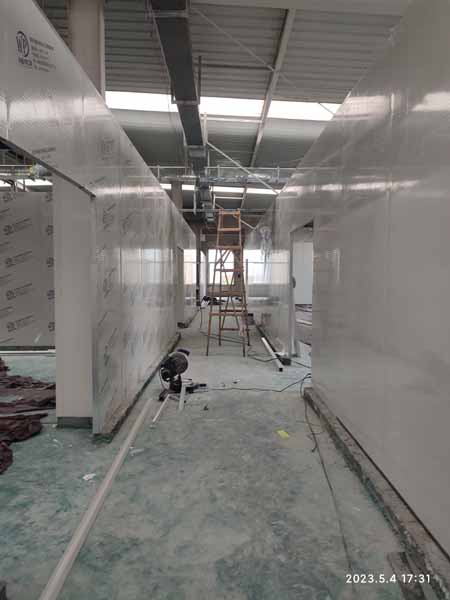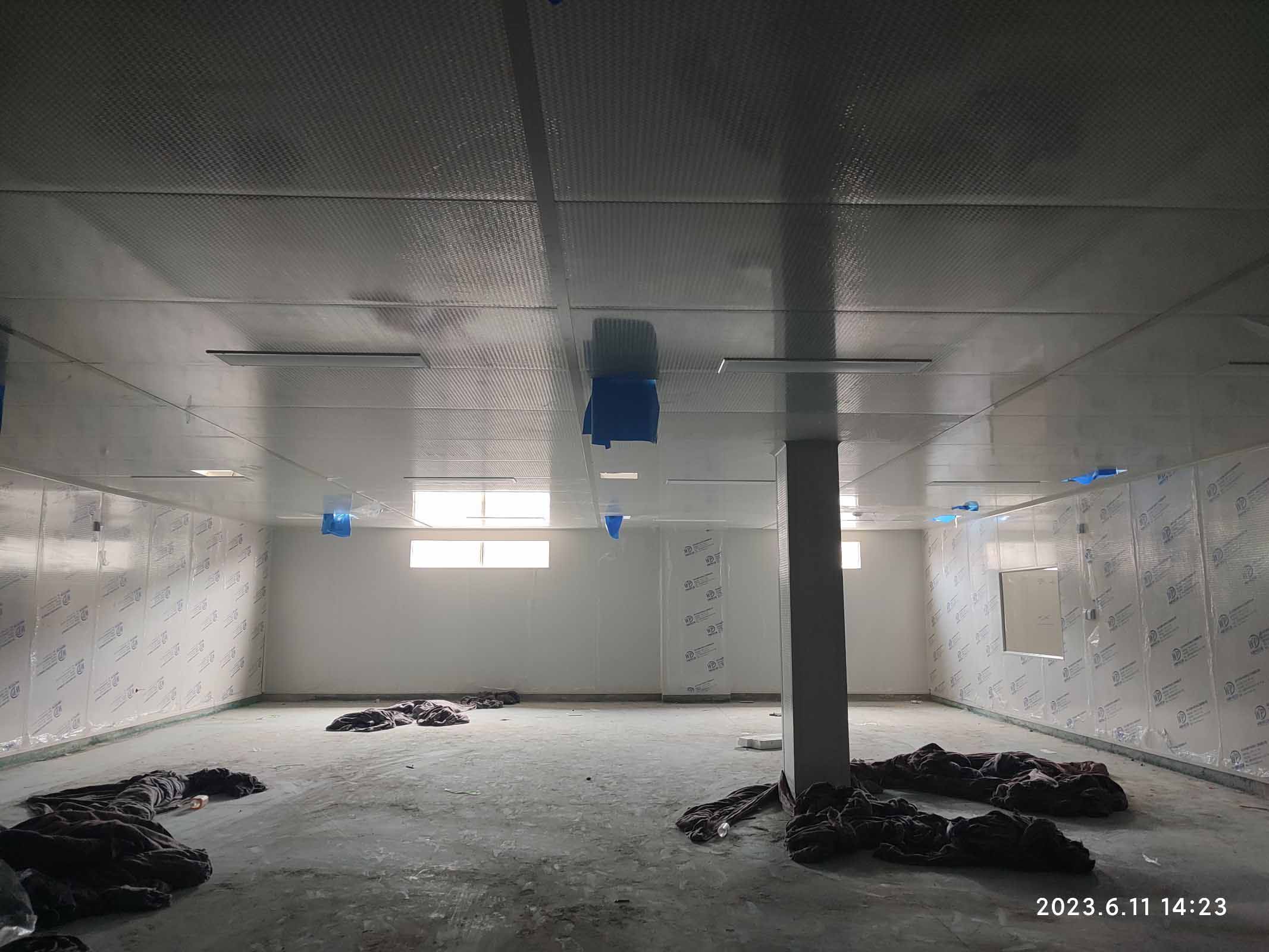 ①、三樓板縫打膠、圓弧安裝完成70%,二樓彩鋼板頂板完成35%; ②、三樓開關,插座面板安裝完成,燈具安裝完成 50%,夾層內照明插座配管穿線完成20%。二樓隔墻開關及插座穿線完成85%,開關,插座面板安裝完成85%,燈具安裝完成10%。 ③、一樓凍庫排管銅管連接完成70%。