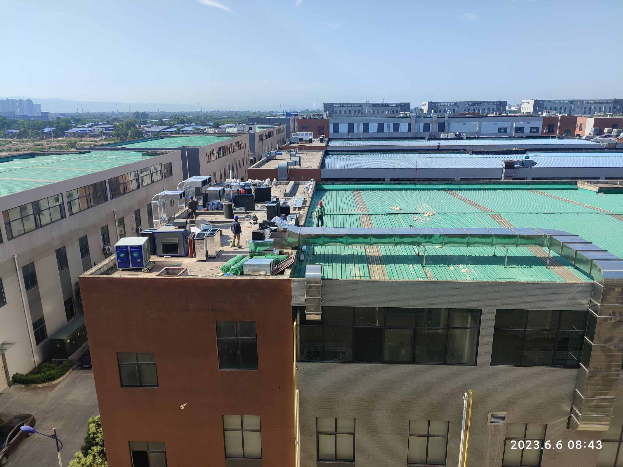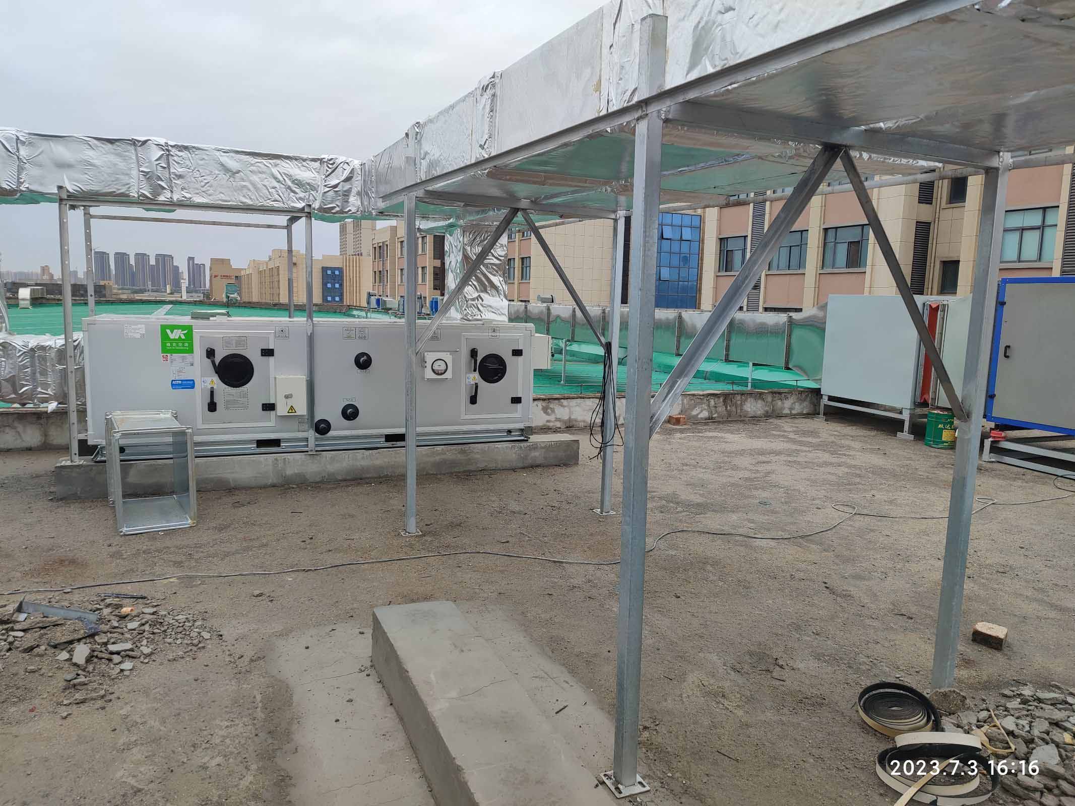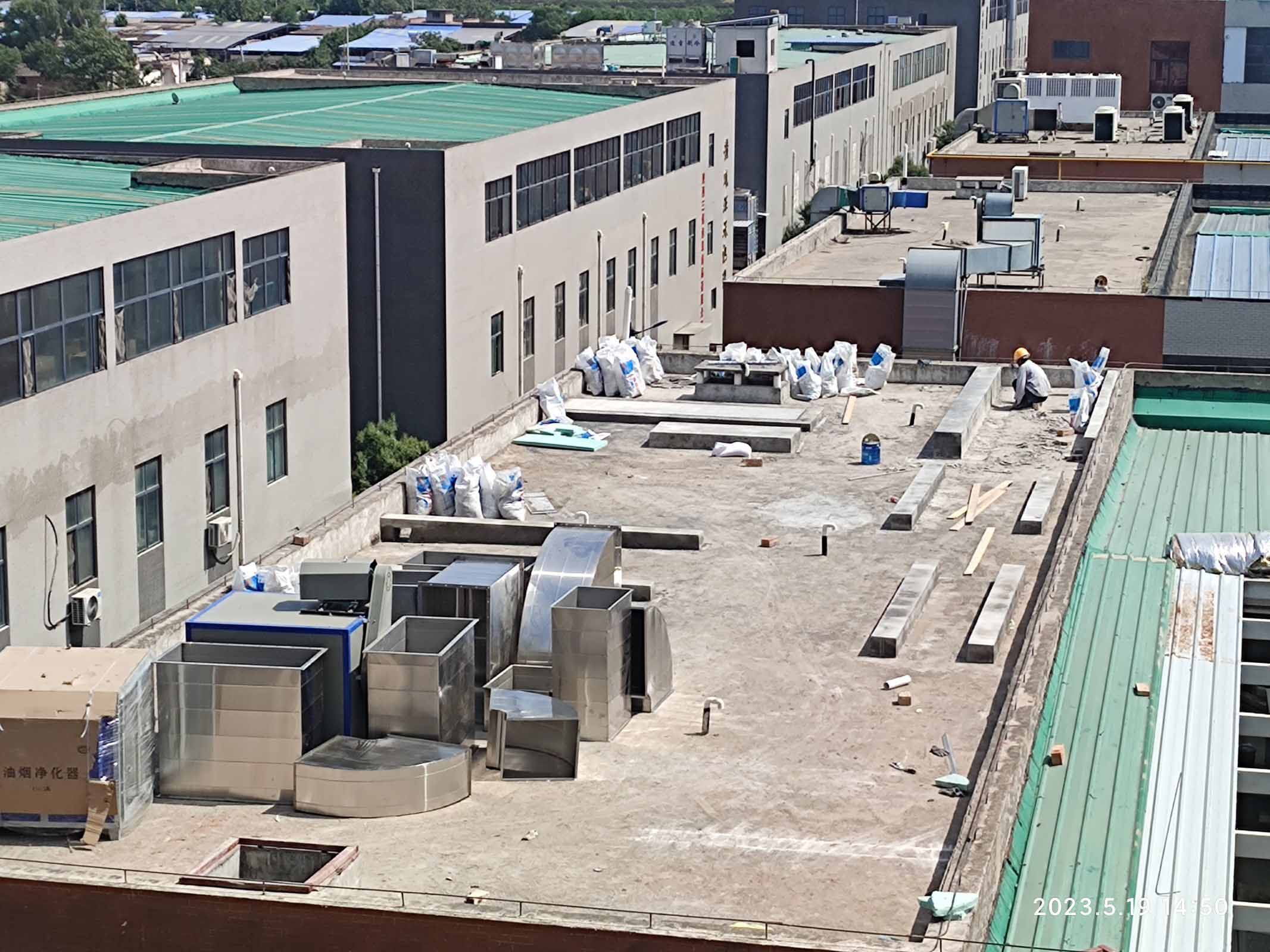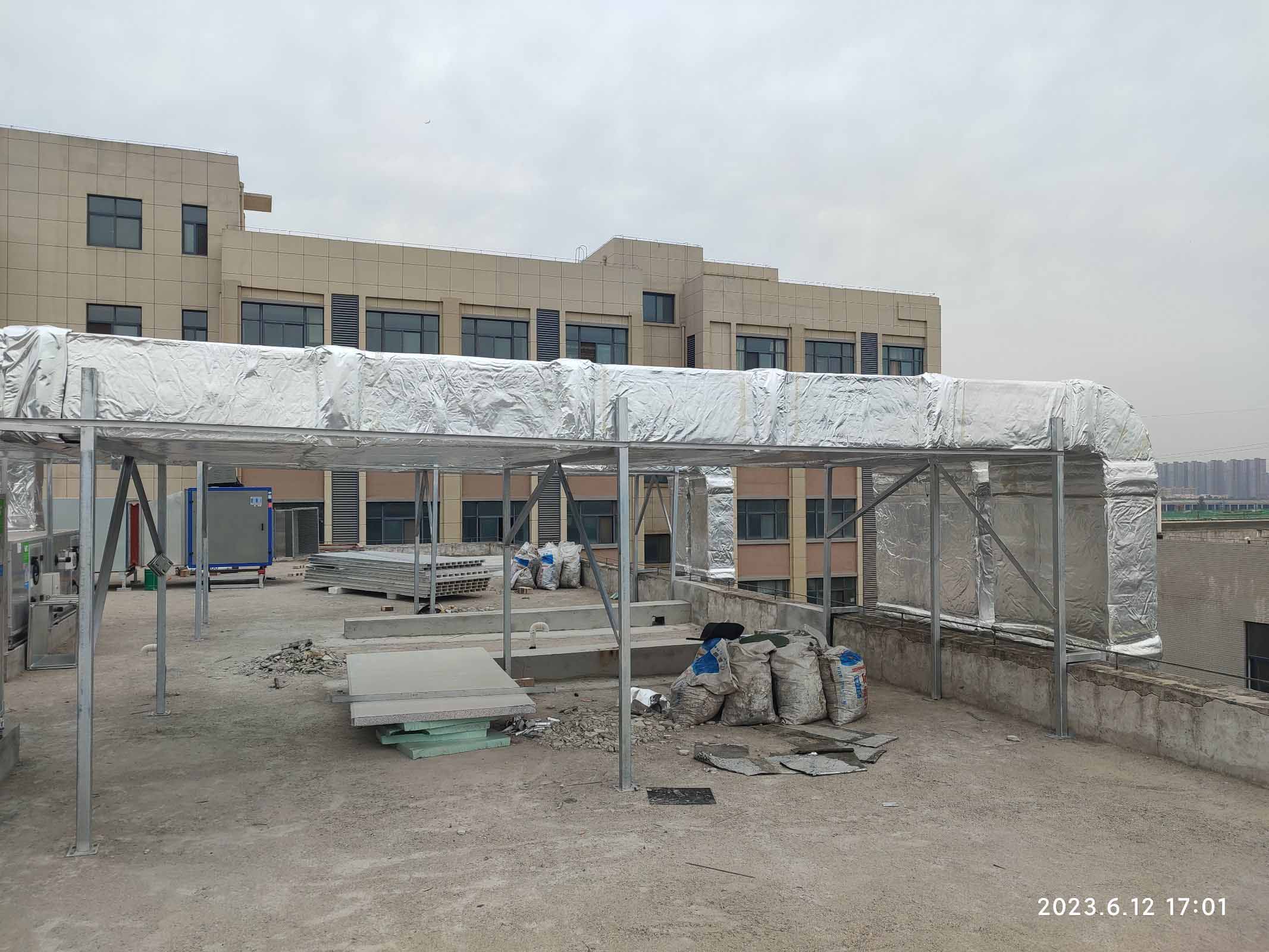 ①、蒸汽管道三樓主管安裝完成80%; ②、二、三樓風機盤管段冷凍水支管保溫完成40%,風機盤管回風管安裝完成; ③、二樓凈化風管主管吊裝完成,法蘭保溫完成80%,高效過濾器箱體保溫棉下料完成90%; ④、三樓彩鋼頂板吊筋制作安裝完成90%,頂板安裝完成60%,圓弧片安裝完成15%,觀察窗窗框制作安裝完成,二樓包裝間頂板吊筋安裝完成; ⑤、三樓的煙罩吊裝完成3個,另一個因外墻玻璃未到貨導致墻板不能安裝,進而導致煙罩無法安裝。 ⑥、屋面設備基礎砌筑完成,正在防水施工。 ⑦、三樓吊頂內PPR給水管道布設完成5%。